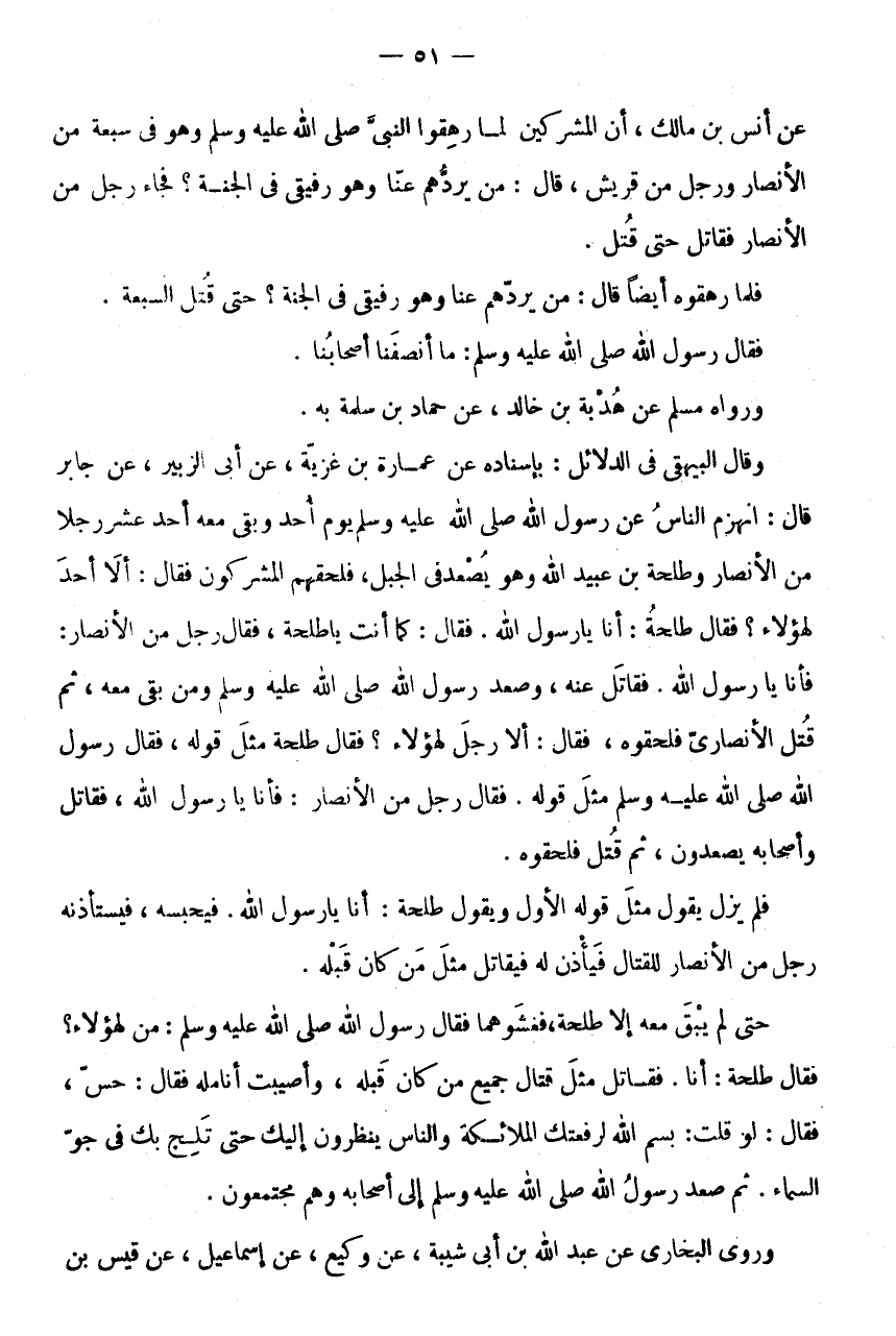 عَنْ أَنَسِ بْنِ مَالِكٍ، أَنَّ الْمُشْرِكِينَ لَمَّا رَهِقُوا النَّبِيِّ صَلَّى اللَّهُ عَلَيْهِ وَسَلَّمَ وَهُوَ فِي سَبْعَة من الانصار وَرجل من قُرَيْش، قَالَ: يَرُدُّهُمْ عَنَّا وَهُوَ رَفِيقِي فِي الْجَنَّةِ؟ فَجَاءَ رَجُلٌ مِنَ الْأَنْصَارِ فَقَاتَلَ حَتَّى قُتِلَ.