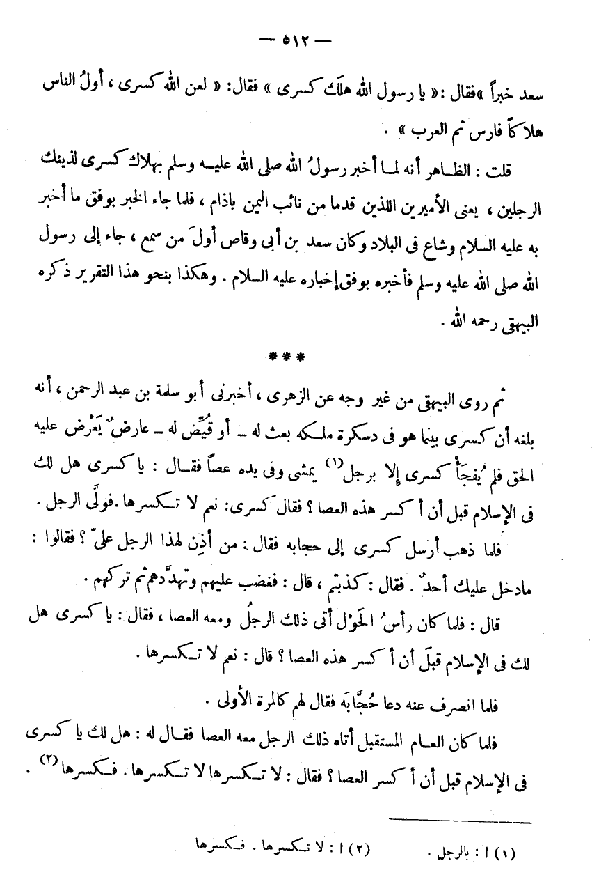 * * * ثُمَّ رَوَى الْبَيْهَقِيُّ مِنْ غَيْرِ وَجْهٍ عَنِ الزُّهْرِيِّ، أَخْبَرَنِي أَبُو سَلَمَةَ بْنُ عَبْدِ الرَّحْمَنِ، أَنَّهُ بَلَغَهُ أَنَّ كِسْرَى بَيْنَمَا هُوَ فِي دَسْكَرَةِ مُلْكِهِ بُعِثَ لَهُ - أَوْ قُيِّضَ لَهُ - عَارِضٌ يَعْرِضُ عَلَيْهِ الْحَقَّ فَلَمْ يَفْجَأْ كِسْرَى إِلَّا بِرَجُلٍ (1) يَمْشِي وَفِي يَدِهِ عَصًا فَقَالَ: يَا كِسْرَى هَلْ لَكَ فِي الْإِسْلَامِ قَبْلَ أَنْ أَكْسِرَ هَذِهِ الْعَصَا؟ فَقَالَ كِسْرَى: نَعَمْ لَا تَكْسِرْهَا.