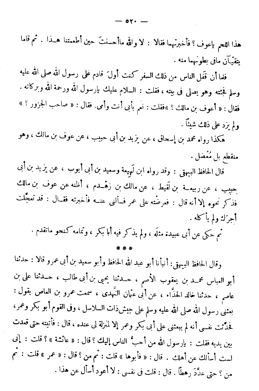 * * * وَقَالَ الْحَافِظُ الْبَيْهَقِيُّ: أَنْبَأَنَا أَبُو عَبْدِ اللَّهِ الْحَافِظُ وَأَبُو سَعِيدِ بْنُ أَبِي عَمْرٍو قَالَا: حَدَّثَنَا أَبُو الْعَبَّاسِ مُحَمَّدُ بْنُ يَعْقُوبَ الاصم، حَدثنَا يَحْيَى بْنِ أَبِي طَالِبٍ، حَدَّثَنَا عَلِيُّ بْنُ عَاصِمٍ، حَدَّثَنَا خَالِدٌ الْحَذَّاءُ، عَنْ أَبِي عُثْمَانَ النَّهْدِيِّ، سَمِعْتُ عَمْرَو بْنَ الْعَاصِ يَقُولُ: بَعَثَنِي رَسُولُ اللَّهِ صَلَّى اللَّهُ عَلَيْهِ وَسَلَّمَ عَلَى جَيْشِ ذَاتِ السَّلَاسِلِ، وَفِي الْقَوْمِ أَبُو بَكْرٍ وَعُمَرُ، فَحَدَّثْتُ نَفْسِي أَنَّهُ لَمْ يَبْعَثْنِي عَلَى أَبِي بَكْرٍ وَعُمَرَ إِلَّا لِمَنْزِلَةٍ لِي عِنْدَهُ، قَالَ: فَأَتَيْتُهُ حَتَّى قَعَدْتُ بَيْنَ يَدَيْهِ فَقُلْتُ: يَا رَسُولَ اللَّهِ مَنْ أَحَبُّ النَّاسِ إِلَيْكَ؟ قَالَ: " عَائِشَةُ "؟ قُلْتُ: إِنِّي لَسْتُ أَسْأَلُكَ عَنْ أَهْلِكِ.