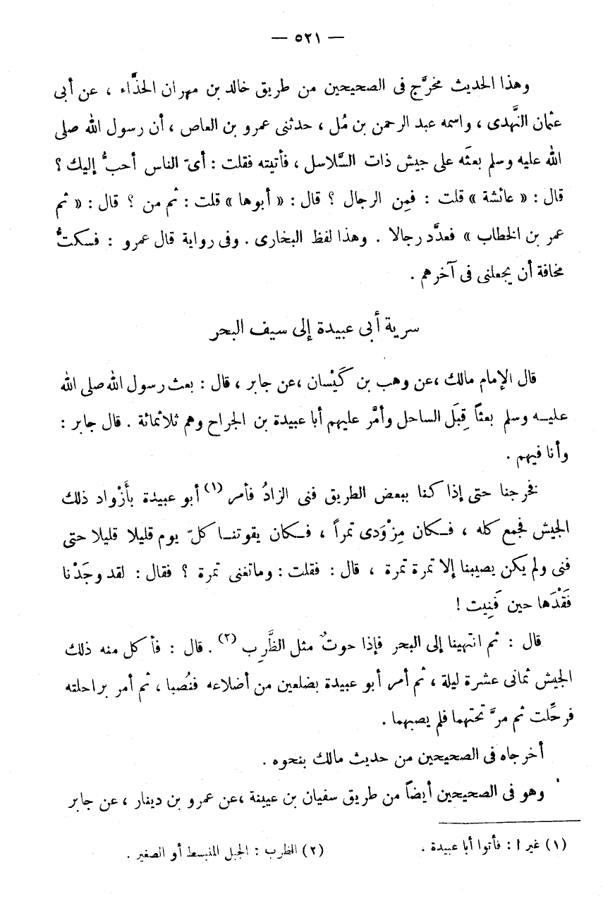 وَهَذَا الْحَدِيثُ مُخَرَّجٌ فِي الصَّحِيحَيْنِ مِنْ طَرِيقِ خَالِدِ بْنِ مِهْرَانَ الْحَذَّاءِ، عَنْ أَبِي عُثْمَانَ النَّهْدِيِّ، وَاسْمُهُ عَبْدُ الرَّحْمَنِ بْنُ مَلٍّ، حَدَّثَنِي عَمْرِو بْنِ الْعَاصِ، أَنَّ رَسُولَ اللَّهِ صَلَّى اللَّهُ عَلَيْهِ وَسَلَّمَ بَعَثَهُ عَلَى جَيْشِ ذَاتِ السَّلَاسِلِ، فَأَتَيْتُهُ فَقُلْتُ: أَيُّ النَّاسِ أَحَبُّ إِلَيْكَ؟ قَالَ: " عَائِشَةُ " قُلْتُ: فَمِنَ الرِّجَالِ؟ قَالَ: " أَبُوهَا " قُلْتُ: ثُمَّ مَنْ؟ قَالَ: " ثُمَّ عُمَرُ بْنُ الْخطاب " فعدد رِجَالًا.