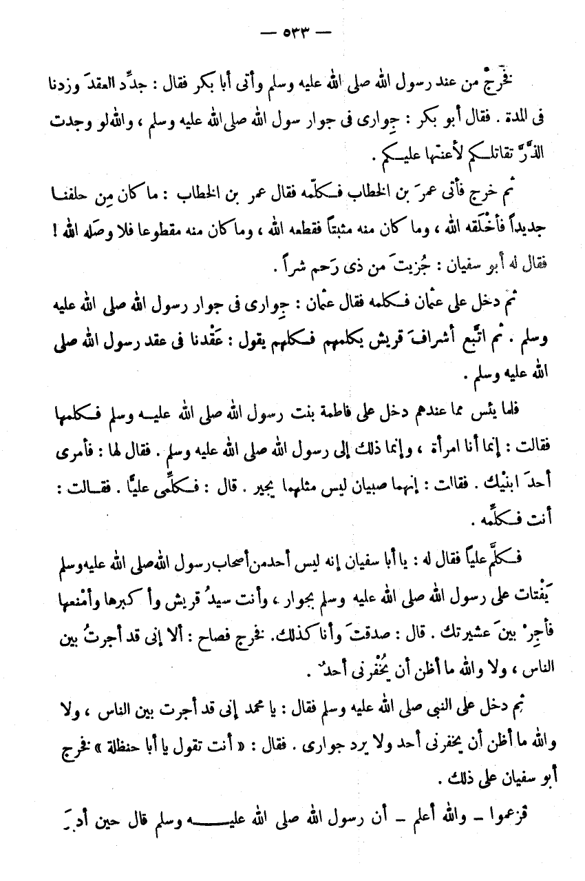 ثُمَّ خَرَجَ فَأَتَى عُمَرَ بْنَ الْخَطَّابِ فَكَلَّمَهُ فَقَالَ عُمَرُ بْنُ الْخَطَّابِ: مَا كَانَ مِنْ حِلْفِنَا جَدِيدًا فَأَخْلَقَهُ اللَّهُ، وَمَا كَانَ مِنْهُ مثبتا فَقَطَعَهُ اللَّهُ، وَمَا كَانَ مِنْهُ مَقْطُوعًا فَلَا وَصَلَهُ اللَّهُ! فَقَالَ لَهُ أَبُو سُفْيَانَ: جُزِيتَ مِنْ ذِي رَحِمٍ شَرًّا.