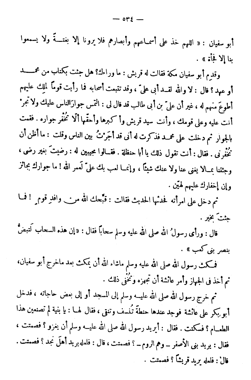 أَبُو سُفْيَانَ: " اللَّهُمَّ خُذْ عَلَى أَسْمَاعِهِمْ وَأَبْصَارِهِمْ فَلَا يَرَوْنَا إِلَّا بَغْتَةً وَلَا يَسْمَعُوا بِنَا إِلَّا فَجْأَةً ".