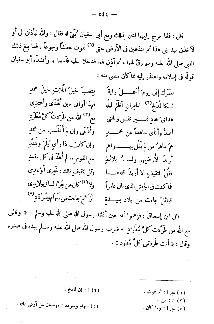 فَلَمَّا بَلَغَ ذَلِكَ النَّبِيَّ صَلَّى اللَّهُ عَلَيْهِ وَسَلَّمَ رَقَّ لَهُمَا، ثُمَّ أَذِنَ لَهُمَا فَدَخَلَا عَلَيْهِ فَأَسْلمَا، وأنشده أَبُو سُفْيَانَ قَوْلَهُ فِي إِسْلَامِهِ وَاعْتَذَرَ إِلَيْهِ مِمَّا كَانَ مَضَى مِنْهُ: لَعَمْرُكَ إِنِّي يَوْمَ أَحْمِلُ رَايَةً * لِتَغْلِبَ خَيْلُ اللَّاتِ خَيْلَ مُحَمَّدِ لكا لمدلج (2) الْحَيْرَانِ أَظْلَمَ لَيْلُهُ * فَهَذَا أَوَانِي حِينَ أُهْدَى وَأَهْتَدِي هَدَانِيَ هَادٍ غَيْرُ نَفْسِي وَنَالَنِي * مَعَ (3) اللَّهِ مَنْ طَرَّدْتُ كُلَّ مُطَرَّدِ أَصُدُّ وَأَنْأَى جَاهِدًا عَنْ مُحَمَّدٍ * وَأُدْعَى وَإِنْ لَمْ أَنْتَسِبْ مِنْ مُحَمَّدِ هُمُ مَا هُمُ مَنْ لَمْ يَقُلْ بِهَوَاهُمُ * وَإِنْ كَانَ ذَا رَأْيٍ يُلَمْ وَيُفَنَّدِ أُرِيدُ لِأُرْضِيهِمْ وَلَسْتُ بِلَائِطٍ * مَعَ الْقَوْمِ مَا لَمْ أُهْدَ فِي كُلِّ مَقْعَدِ فَقُلْ لِثَقِيفٍ لَا أُرِيدُ قِتَالَهَا * وَقُلْ لِثَقِيفٍ تِلَكَ: غَيْرِيَ أَوْعِدِي فَمَا كُنْتُ فِي الْجَيْشِ الَّذِي نَالَ عَامِرًا * وَلَا (4) كَانَ عَنْ جَرَّا لِسَانِي وَلَا يَدِي قَبَائِلُ جَاءَتْ مِنْ بِلَادٍ بَعِيدَةٍ * نَزَائِعُ جَاءَتْ مِنْ سِهَامٍ وَسَرْدُدِ (5) قَالَ ابْنُ إِسْحَاقَ: فَزَعَمُوا أَنَّهُ حِينَ أَنْشَدَ رَسُولَ اللَّهِ صَلَّى اللَّهُ عَلَيْهِ وَسَلَّمَ: " وَنَالَنِي مَعَ اللَّهِ مَنْ طَرَّدْتُ كُلَّ مُطَرَّدِ " ضَرَبَ رَسُولُ اللَّهِ صَلَّى اللَّهُ عَلَيْهِ وَسَلَّمَ بِيَدِهِ فِي صَدْرِهِ وَقَالَ: " أَنْتَ طَرَّدْتَنِي كل مطرد ".