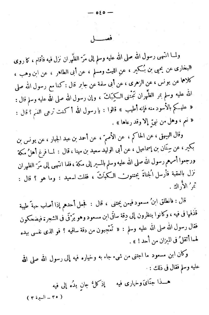 فصل وَلَمَّا انْتَهَى رَسُولُ اللَّهِ صَلَّى اللَّهُ عَلَيْهِ وَسَلَّمَ إِلَى مَرِّ الظَّهْرَانِ نَزَلَ فِيهِ فَأَقَامَ، كَمَا رَوَى الْبُخَارِيُّ عَنْ يَحْيَى بْنِ بُكَيْرٍ، عَنِ اللَّيْثِ وَمُسْلِمٍ، عَنْ أَبِي الطَّاهِرِ، عَنِ ابْنِ وَهْبٍ، كِلَاهُمَا عَنْ يُونُسَ، عَنِ الزُّهْرِيِّ، عَنْ أَبِي سَلَمَةَ عَنْ جَابِرٍ قَالَ: كُنَّا مَعَ رَسُولِ اللَّهِ صَلَّى اللَّهُ عَلَيْهِ وَسَلَّمَ بِمَرِّ الظَّهْرَانِ نَجْتَنِي الْكَبَاثَ، وَإِنَّ رَسُولَ اللَّهِ صَلَّى اللَّهُ عَلَيْهِ وَسَلَّمَ قَالَ: " عَلَيْكُمْ بِالْأَسْوَدِ مِنْهُ فَإِنَّهُ أَطْيَبُ " قَالُوا: يَا رَسُولَ اللَّهِ أَكُنْتَ تَرْعَى الْغَنَمَ؟ قَالَ: " نَعَمْ، وَهَلْ مِنْ نَبِيٍّ إِلَّا وَقَدْ رَعَاهَا ".