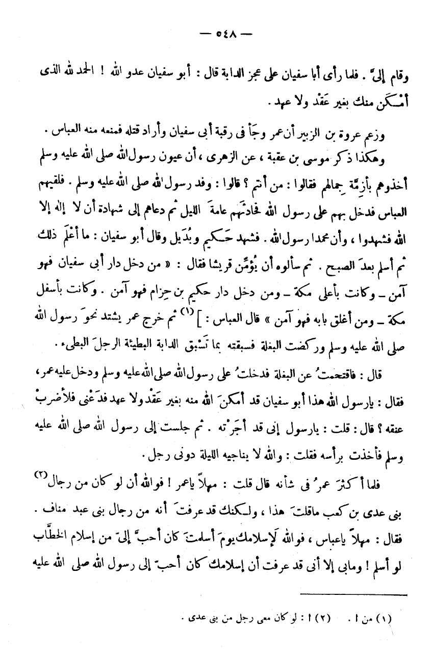 وَكَانَتْ بِأَسْفَلِ مَكَّةَ - وَمَنْ أَغْلَقَ بَابَهُ فَهُوَ آمِنٌ " قَالَ الْعَبَّاسُ:] (1) ثُمَّ خَرَجَ عُمَرُ يَشْتَدُّ نَحْوَ رَسُولِ اللَّهِ صَلَّى اللَّهُ عَلَيْهِ وَسَلَّمَ وَرَكَضَتِ الْبَغْلَةُ فسبقته بِمَا تسبق الدَّابَّة البطيئة الرجل البطئ.