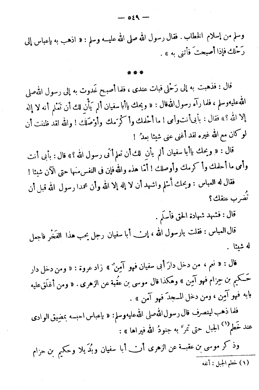 * * * قَالَ: فَذَهَبْتُ بِهِ إِلَى رَحْلِي فَبَاتَ عِنْدِي، فَلَمَّا أَصْبَحَ غَدَوْتُ بِهِ إِلَى رَسُولِ اللَّهِ صَلَّى اللَّهُ عَلَيْهِ وَسَلَّمَ، فَلَمَّا رَآهُ رَسُول الله قَالَ: " وَيْحَكَ يَا أَبَا سُفْيَانَ أَلَمْ يَأْنِ لَكَ أَنْ تَعْلَمَ أَنَّهُ لَا إِلَهَ إِلَّا اللَّهُ؟ " فَقَالَ: بِأَبِي أَنْتَ وَأُمِّي! مَا أَحَلَمَكَ وَأَكْرَمَكَ وَأَوْصَلَكَ! وَاللَّهِ لَقَدْ ظَنَنْتُ أَنْ لَوْ كَانَ مَعَ اللَّهِ غَيْرُهُ لَقَدْ أَغْنَى عَنِّي شَيْئًا بَعْدُ! قَالَ: " وَيْحَكَ يَا أَبَا سُفْيَانَ أَلَمْ يَأْنِ لَكَ أَنْ تَعْلَمَ أَنِّي رَسُولُ اللَّهِ؟ " قَالَ: بِأَبِي أَنْتَ وَأُمِّي مَا أَحَلَمَكَ وَأَكْرَمَكَ وَأَوْصَلَكَ! أَمَّا هَذِهِ وَاللَّهِ فَإِنَّ فِي النَّفْسِ مِنْهَا حَتَّى الْآنَ شَيْئًا! فَقَالَ لَهُ الْعَبَّاسُ: وَيْحَكَ أَسْلِمْ وَاشْهَدْ أَنْ لَا إِلَهَ إِلَّا اللَّهُ وَأَنَّ مُحَمَّدًا رَسُولُ اللَّهِ قَبْلَ أَنْ تُضْرَبَ عُنُقُكَ؟ قَالَ: فَشَهِدَ شَهَادَةَ الْحَقِّ فَأَسْلَمَ.