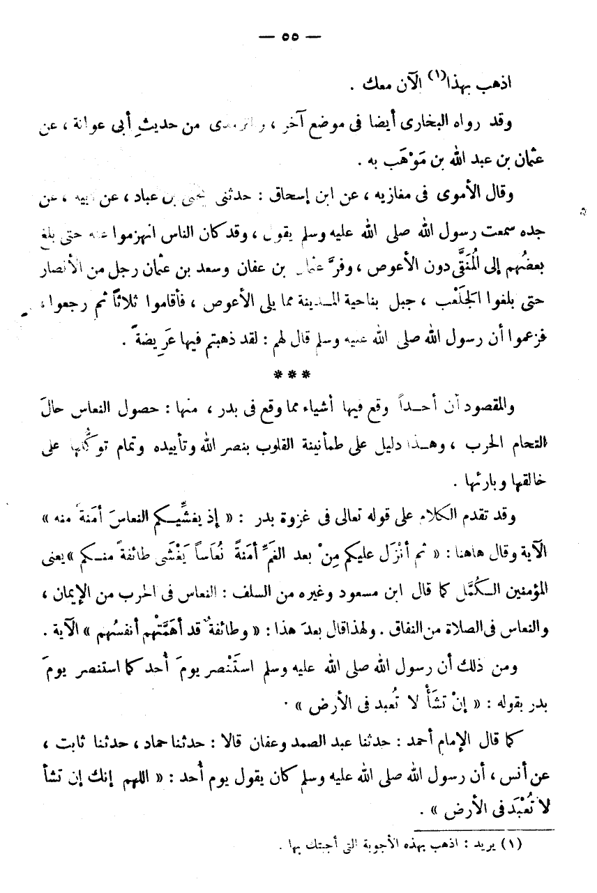 وَمِنْ ذَلِكَ أَنَّ رَسُولَ اللَّهِ صَلَّى اللَّهُ عَلَيْهِ وَسَلَّمَ اسْتَنْصَرَ يَوْمَ أُحُدٍ كَمَا اسْتَنْصَرَ يَوْمَ بِدْرٍ بِقَوْلِهِ: " إِنْ تَشَأْ لَا تُعْبَدُ فِي الْأَرْضِ ".