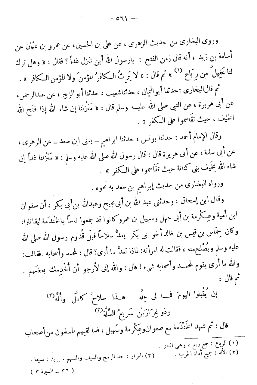 وَرَوَى الْبُخَارِيُّ مِنْ حَدِيثِ الزُّهْرِيِّ، عَنْ عَلِيِّ بْنِ الْحُسَيْنِ، عَنْ عَمْرِو بْنِ عُثْمَانَ عَنْ أُسَامَةَ بْنِ زَيْدٍ، أَنَّهُ قَالَ زَمَنَ الْفَتْحِ: يَا رَسُولَ اللَّهِ أَيْنَ تَنْزِلُ غَدًا؟ فَقَالَ: " وَهَلْ تَرَكَ لَنَا عَقِيلٌ مِنْ رُبَاعٍ (1) " ثُمَّ قَالَ: " لَا يَرث الْكَافِر الْمُؤمن وَلَا الْمُؤمن الْكَافِر ".