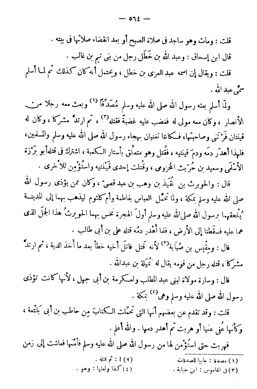 قَالَ: وَسَارَةُ مَوْلَاةٌ لِبَنِي عَبْدِ الْمُطَّلِبِ وَلِعِكْرِمَةَ بْنِ أَبِي جَهْلٍ، لِأَنَّهَا كَانَتْ تُؤْذِي رَسُولِ اللَّهِ صَلَّى اللَّهُ عَلَيْهِ وَسَلَّمَ وَهِيَ (4) بِمَكَّةَ.