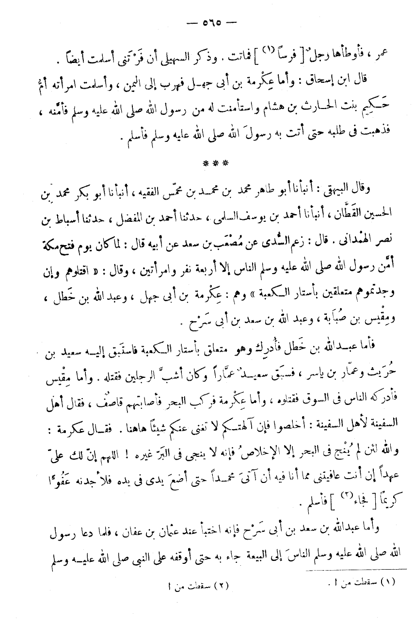 قَالَ: زَعَمَ السُّدِّيُّ عَنْ مُصْعَبِ بْنِ سَعْدٍ عَنْ أَبِيهِ قَالَ: لَمَّا كَانَ يَوْمَ فَتْحِ مَكَّةَ آمَنَ رَسُولُ اللَّهِ صَلَّى اللَّهُ عَلَيْهِ وَسَلَّمَ النَّاسَ إِلَّا أَرْبَعَةَ نَفَرٍ وَامْرَأَتَيْنِ، وَقَالَ: " اقْتُلُوهُمْ وَإِنْ وَجَدْتُمُوهُمْ مُتَعَلِّقِينَ بِأَسْتَارِ الْكَعْبَةِ " وَهُمْ: عِكْرِمَةُ بْنُ أَبِي جَهْلٍ، وَعَبْدُ اللَّهِ بْنُ خَطَلٍ، وَمِقْيَسُ بْنُ صبَابَة، وَعبد الله بن سعد بن أبي سَرْحٍ.