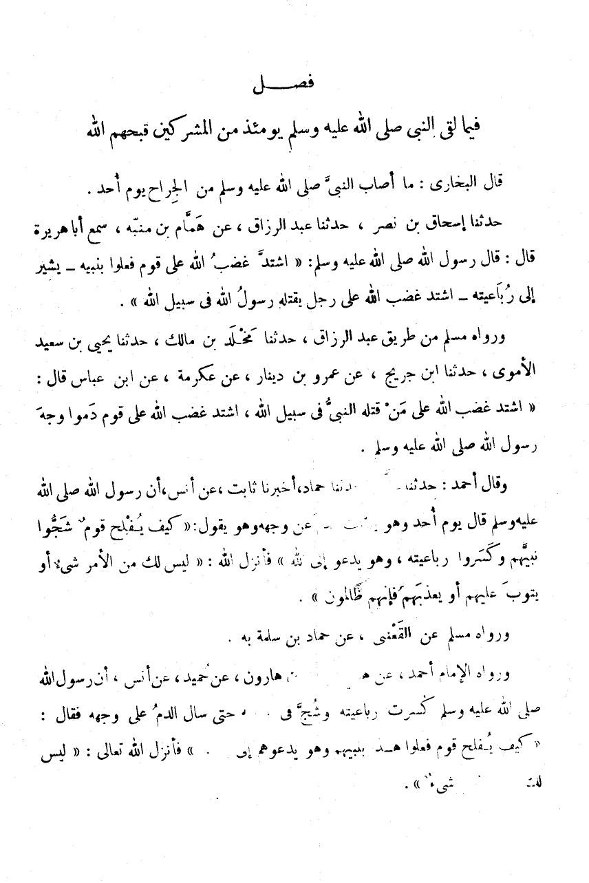 فَصْلٌ فِيمَا لَقِيَ النَّبِيُّ صَلَّى اللَّهُ عَلَيْهِ وَسَلَّمَ يَوْمَئِذٍ مِنَ الْمُشْرِكِينَ قَبَّحَهُمُ اللَّهُ قَالَ الْبُخَارِيُّ: مَا أَصَابَ النَّبِيُّ صَلَّى اللَّهُ عَلَيْهِ وَسَلَّمَ مِنَ الْجِرَاحِ يَوْمَ أُحُدٍ.