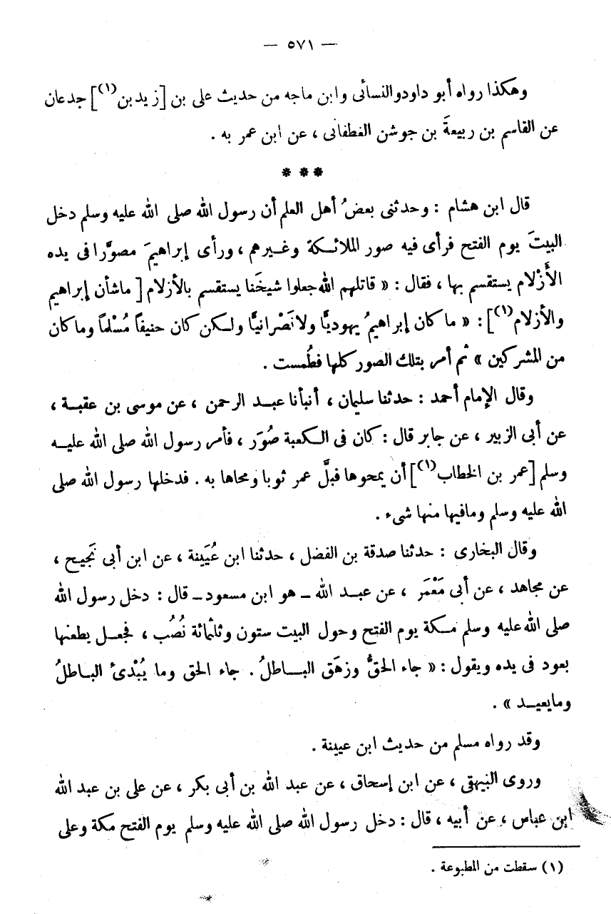 * * * قَالَ ابْنُ هِشَامٍ: وَحَدَّثَنِي بَعْضُ أَهْلِ الْعِلْمِ أَنَّ رَسُولَ اللَّهِ صَلَّى اللَّهُ عَلَيْهِ وَسَلَّمَ دَخَلَ الْبَيْتَ يَوْمَ الْفَتْحِ فَرَأَى فِيهِ صُوَرَ الْمَلَائِكَةِ وَغَيْرِهِمْ، وَرَأَى إِبْرَاهِيم مُصَوَّرًا فِي يَدِهِ الْأَزْلَامُ يَسْتَقْسِمُ بِهَا، فَقَالَ: " قَاتَلَهُمُ اللَّهُ جَعَلُوا شَيْخَنَا يَسْتَقْسِمُ بِالْأَزْلَامِ [مَا شَأْنُ إِبْرَاهِيمَ وَالْأَزْلَامِ (1) ] : " مَا كَانَ إِبْرَاهِيمُ يَهُودِيًّا وَلَا نَصْرَانِيًّا وَلَكِنْ كَانَ حَنِيفًا مُسْلِمًا وَمَا كَانَ مِنَ الْمُشْرِكِينَ " ثُمَّ أَمَرَ بِتِلْكَ الصُّوَرِ كُلِّهَا فَطُمِسَتْ.