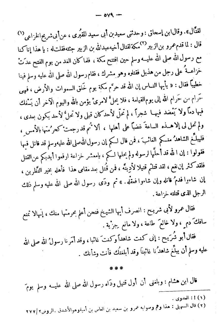 وَقَالَ ابْنُ إِسْحَاقَ: وَحَدَّثَنِي سَعِيدِ بْنِ أَبِي سَعِيدٍ الْمَقْبُرِيِّ، عَنْ أَبِي شُرَيْحٍ الْخُزَاعِيِّ (1) قَالَ: لَمَّا قَدِمَ عَمْرُو بْنُ الزُّبَيْرِ (2) مَكَّةَ لِقِتَالِ أَخِيهِ عَبْدِ اللَّهِ بْنِ الزُّبَيْرِ جِئْتُهُ فَقُلْتُ لَهُ: يَا هَذَا إِنَّا كُنَّا مَعَ رَسُولِ اللَّهِ صَلَّى اللَّهُ عَلَيْهِ وَسَلَّمَ حِين افْتَتَحَ مَكَّةَ، فَلَمَّا كَانَ الْغَدُ مِنْ يَوْمِ الْفَتْحِ عَدَتْ خُزَاعَةُ عَلَى رَجُلٍ مِنْ هُذَيْلٍ فَقَتَلُوهُ وَهُوَ مُشْرِكٌ، فَقَامَ رَسُولُ اللَّهِ صَلَّى اللَّهُ عَلَيْهِ وَسَلَّمَ فِينَا خَطِيبًا فَقَالَ: " يأيها النَّاسُ إِنَّ اللَّهَ قَدْ حَرَّمَ مَكَّةَ يَوْمَ خلق السَّمَوَات وَالْأَرْضَ، فَهِيَ حَرَامٌ مِنْ حَرَامِ اللَّهِ إِلَى يَوْمِ الْقِيَامَةِ، فَلَا يَحِلُّ لِامْرِئٍ يُؤْمِنُ بِاللَّهِ وَالْيَوْمِ الْآخِرِ أَنْ يَسْفِكَ فِيهَا دَمًا وَلَا يعضد فِيهَا شَجرا، لم تحل لِأَحَدٍ كَانَ قَبْلِي وَلَا تَحِلُّ لِأَحَدٍ يَكُونُ بعدى، وَلم تحل لِي إِلَّا هَذِهِ السَّاعَةَ غَضَبًا عَلَى أَهْلِهَا، أَلَا ثُمَّ قَدْ رَجَعَتْ كَحُرْمَتِهَا بِالْأَمْسِ، فَلْيُبَلِّغِ الشَّاهِدُ مِنْكُمُ الْغَائِبَ، فَمَنْ قَالَ لَكُمْ إِنَّ رَسُولَ اللَّهِ صَلَّى اللَّهُ عَلَيْهِ وَسَلَّمَ قد قَاتَلَ فِيهَا فَقُولُوا: إِنَّ اللَّهَ قَدْ أَحَلَّهَا لِرَسُولِهِ وَلَمْ يُحِلَّهَا لَكُمْ، يَا مَعْشَرَ خُزَاعَةَ ارْفَعُوا أَيْدِيَكُمْ عَنِ الْقَتْلِ فَلَقَدْ كَثُرَ إِنْ نَفَعَ، لَقَدْ قَتَلْتُمْ قَتِيلًا لَأَدِيَنَّهُ، فَمَنْ قُتِلَ بَعْدَ مَقَامِي هَذَا فَأَهْلُهُ بِخَيْرِ النَّظَرَيْنِ، إِنْ شَاءُوا فَدَمُ قَاتِلِهِ وَإِنْ شَاءُوا فَعَقْلُهُ.