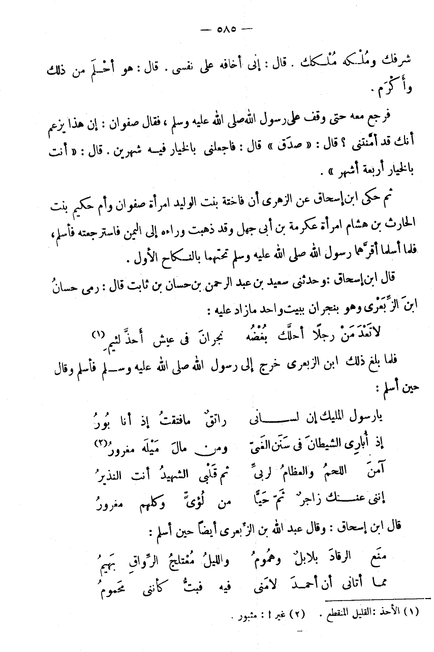 قَالَ ابْنُ إِسْحَاقَ: وَحَدَّثَنِي سَعِيدُ بْنُ عَبْدِ الرَّحْمَنِ بْنِ حَسَّانَ بْنِ ثَابِتٍ قَالَ: رَمَى حَسَّانُ ابْنَ الزِّبَعْرَى وَهُوَ بِنَجْرَانَ بِبَيْتٍ وَاحِدٍ مَا زَادَ عَلَيْهِ: لاتعد من رَجُلًا أَحَلَّكَ بُغْضُهُ * نَجْرَانَ فِي عَيْشٍ أَحَذَّ لَئِيمِ (1) فَلَمَّا بَلَغَ ذَلِكَ ابْنَ الزِّبَعْرَى خَرَجَ إِلَى رَسُولِ اللَّهِ صَلَّى اللَّهُ عَلَيْهِ وَسَلَّمَ فَأَسْلَمَ وَقَالَ حِينَ أَسْلَمَ: يَا رَسُولَ الْمَلِيكِ إِنَّ لِسَانِي * رَاتِقٌ مَا فَتَقْتُ إِذْ أَنَا بور إِذْ أبارى الشَّيْطَان فِي سنَن الغى * وَمن مَال ميله مغرور (2) آمَنَ اللَّحْمُ وَالْعِظَامُ لِرَبِّي * ثُمَّ قَلْبِي الشَّهِيدُ أَنْتَ النَّذِيرُ إِنَّنِي عَنْكَ زَاجِرٌ ثَمَّ حَيًّا * مِنْ لُؤَيٍّ وَكُلُّهُمْ مَغْرُورُ قَالَ ابْنُ إِسْحَاقَ: وَقَالَ عَبْدُ اللَّهِ بْنُ الزِّبَعْرَى أَيْضًا حِينَ أَسْلَمَ: مَنَعَ الرُّقَادَ بَلَابِلٌ وَهُمُومُ * وَاللَّيْلُ مُعْتَلِجُ الرِّوَاقِ بَهِيمُ مِمَّا أَتَانِي أَنَّ أَحْمَدَ لَامَنِي * فِيهِ فَبت كأننى مَحْمُوم