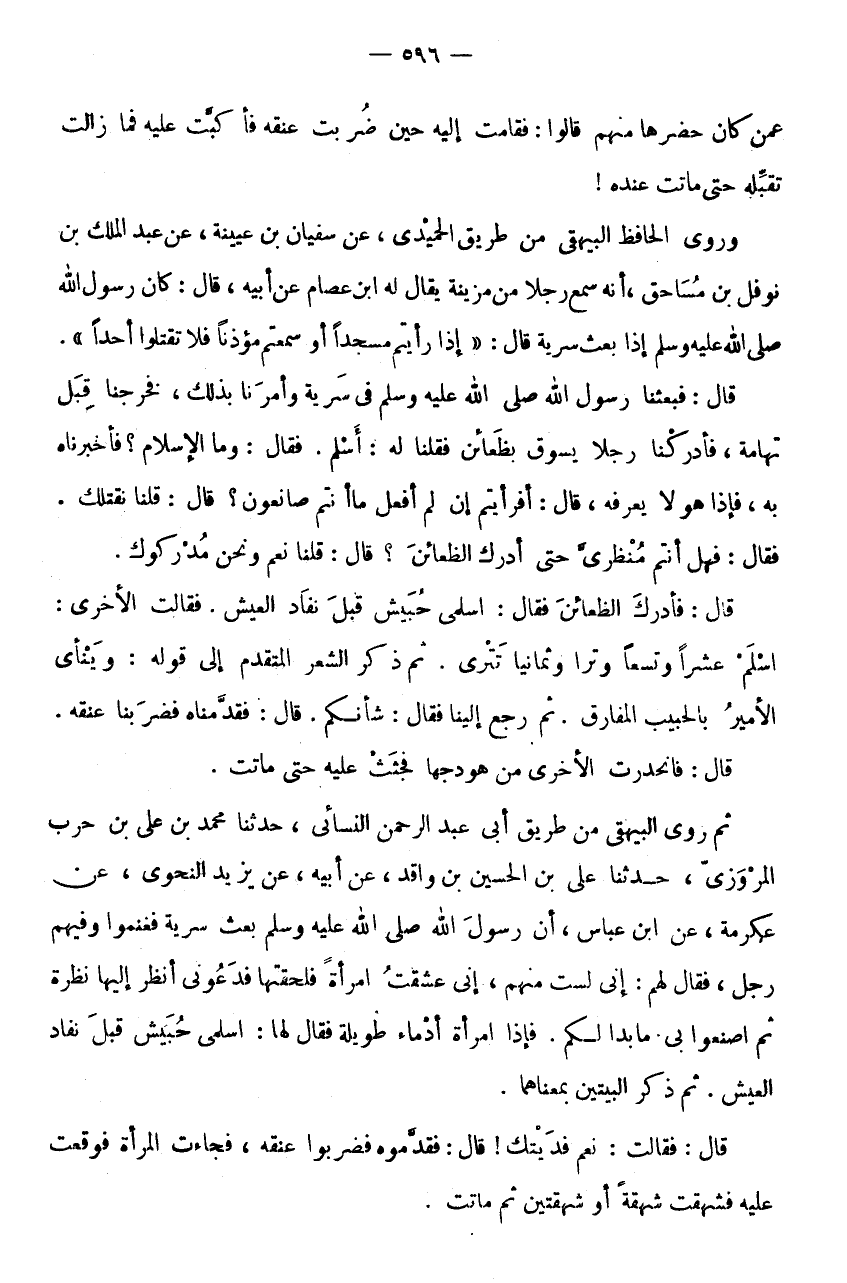 عَمَّنْ كَانَ حَضَرَهَا مِنْهُمْ قَالُوا: فَقَامَتْ إِلَيْهِ حِينَ ضُرِبَتْ عُنُقُهُ فَأَكَبَّتْ عَلَيْهِ فَمَا زَالَتْ تُقَبِّلُهُ حَتَّى مَاتَتْ عِنْدَهُ! وَرَوَى الْحَافِظُ الْبَيْهَقِيُّ مِنْ طَرِيقِ الْحُمَيْدِيُّ، عَنْ سُفْيَانَ بْنِ عُيَيْنَةَ، عَنْ عَبْدِ الْمَلِكِ بْنِ نَوْفَلِ بْنِ مُسَاحِقٍ، أَنَّهُ سَمِعَ رَجُلًا مَنْ مُزَيْنَةَ يُقَالُ لَهُ ابْنُ عِصَامٍ عَنْ أَبِيهِ، قَالَ: كَانَ رَسُولُ اللَّهِ صَلَّى اللَّهُ عَلَيْهِ وَسَلَّمَ إِذَا بَعَثَ سَرِيَّةً قَالَ: " إِذَا رَأَيْتُمْ مَسْجِدًا أَوْ سَمِعْتُمْ مُؤَذِّنًا فَلَا تَقْتُلُوا أَحَدًا ".