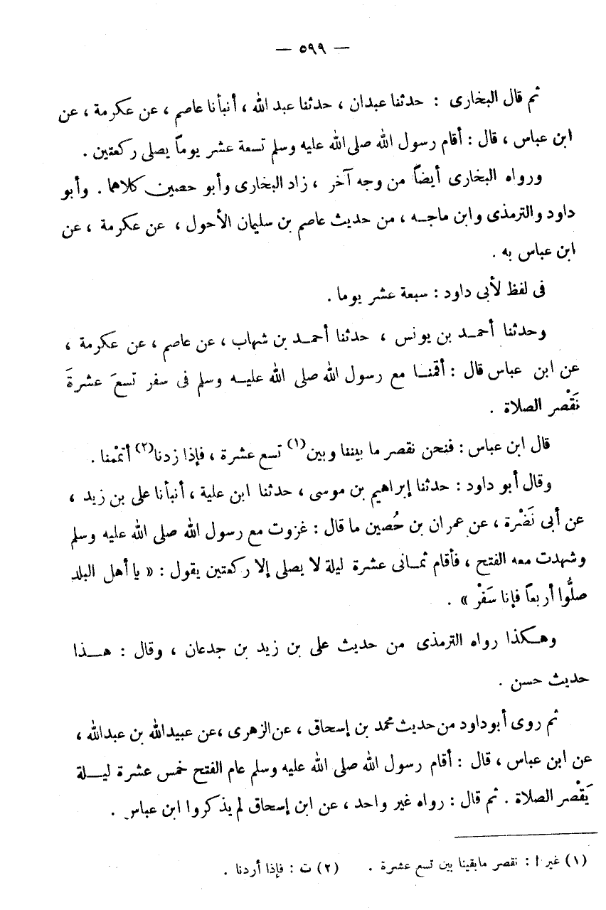 ثمَّ قَالَ الْبُخَارِيُّ: حَدَّثَنَا عَبْدَانُ، حَدَّثَنَا عَبْدُ اللَّهِ، أَنْبَأَنَا عَاصِمٌ، عَنْ عِكْرِمَةَ، عَنِ ابْنِ عَبَّاسٍ، قَالَ: أَقَامَ رَسُولُ اللَّهِ صَلَّى اللَّهُ عَلَيْهِ وَسلم تِسْعَةَ عَشَرَ يَوْمًا يُصَلِّي رَكْعَتَيْنِ.