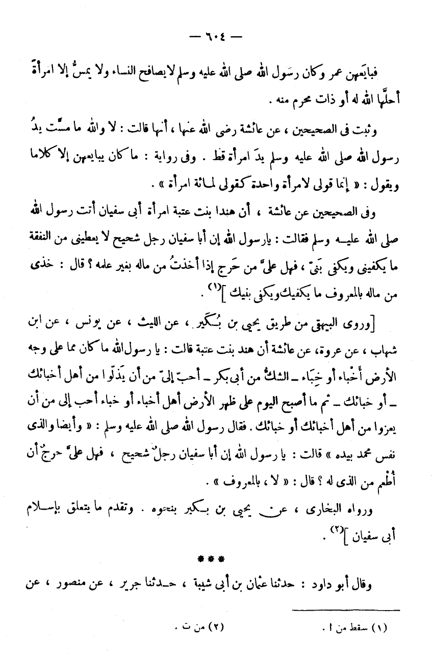 وَفِي الصَّحِيحَيْنِ عَن عَائِشَة، أَن هندا بِنْتَ عُتْبَةَ امْرَأَةَ أَبِي سُفْيَانَ أَتَتْ رَسُولِ اللَّهِ صَلَّى اللَّهُ عَلَيْهِ وَسَلَّمَ فَقَالَتْ: يَا رَسُولَ اللَّهِ إِنَّ أَبَا سُفْيَانَ رَجُلٌ شَحِيحٌ لَا يُعْطِينِي مِنَ النَّفَقَةِ مَا يَكْفِينِي وَيَكْفِي بَنِيَّ، فَهَلْ عَلَيَّ مِنْ حَرَجٍ إِذَا أَخَذْتُ مِنْ مَالِهِ بِغَيْرِ عِلْمِهِ؟ قَالَ: خُذِي مِنْ مَالِهِ بِالْمَعْرُوفِ مَا يَكْفِيكِ وَيَكْفِي بَنِيكِ] (1) .