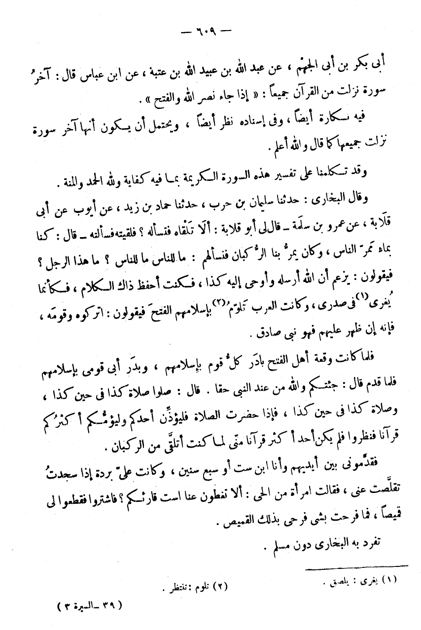 أَبى بكر بن أَبى الجهم، عَنْ عَبْدِ اللَّهِ بْنِ عُبَيْدِ اللَّهِ بْنِ عُتْبَةَ، عَنِ ابْنِ عَبَّاسٍ قَالَ: آخِرُ سُورَةٍ نَزَلَتْ مِنَ الْقُرْآنِ جَمِيعًا: " إِذَا جَاءَ نصر الله وَالْفَتْح ".