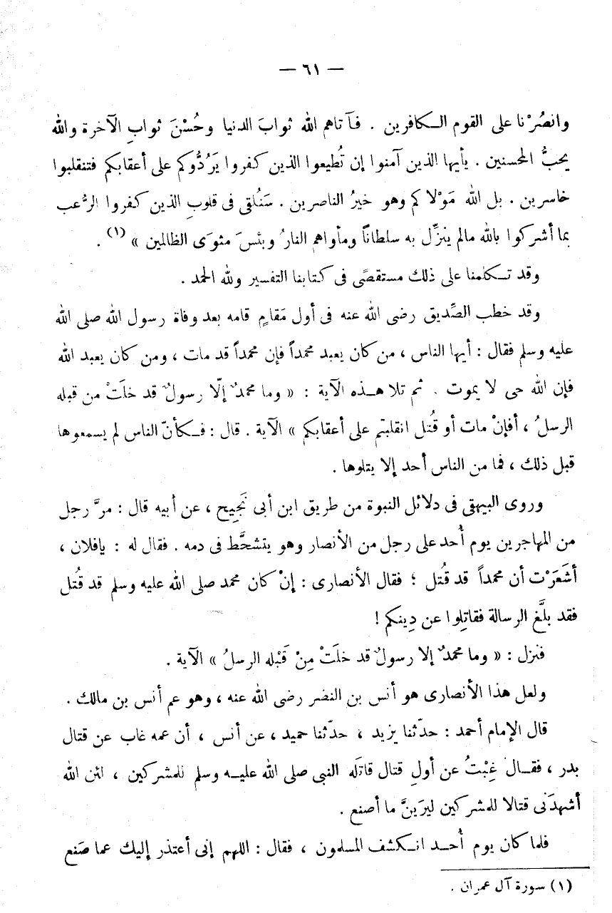 فَقَالَ لَهُ: يَا فُلَانُ، أَشْعَرْتَ أَنَّ مُحَمَّدًا قَدْ قُتِلَ، فَقَالَ الْأَنْصَارِيُّ: إِنْ كَانَ مُحَمَّدٌ صَلَّى اللَّهُ عَلَيْهِ وَسَلَّمَ قَدْ قُتِلَ فَقَدْ بَلَّغَ الرِّسَالَةَ فَقَاتِلُوا عَنْ دِينِكُمْ! فَنَزَلَ: " وَمَا مُحَمَّدٌ إِلَّا رَسُولٌ قَدْ خَلَتْ مِنْ قَبْلِهِ الرُّسُلُ " الْآيَةَ.