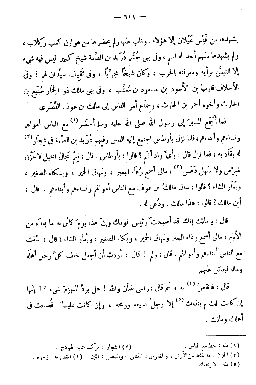 فَلَمَّا أجمع الْمسير إِلَى رَسُولِ اللَّهِ صَلَّى اللَّهُ عَلَيْهِ وَسَلَّمَ أحضر (1) مَعَ النَّاسِ أَمْوَالَهُمْ وَنِسَاءَهُمْ وَأَبْنَاءَهُمْ، فَلَمَّا نَزَلَ بِأَوْطَاسٍ اجْتَمَعَ إِلَيْهِ النَّاسُ وَفِيهِمْ دُرَيْدُ بْنُ الصِّمَّةِ فِي شِجَارٍ (2) لَهُ يُقَادُ بِهِ، فَلَمَّا نَزَلَ قَالَ: بِأَيِّ وَادٍ أَنْتُمْ؟ قَالُوا: بِأَوْطَاسٍ.