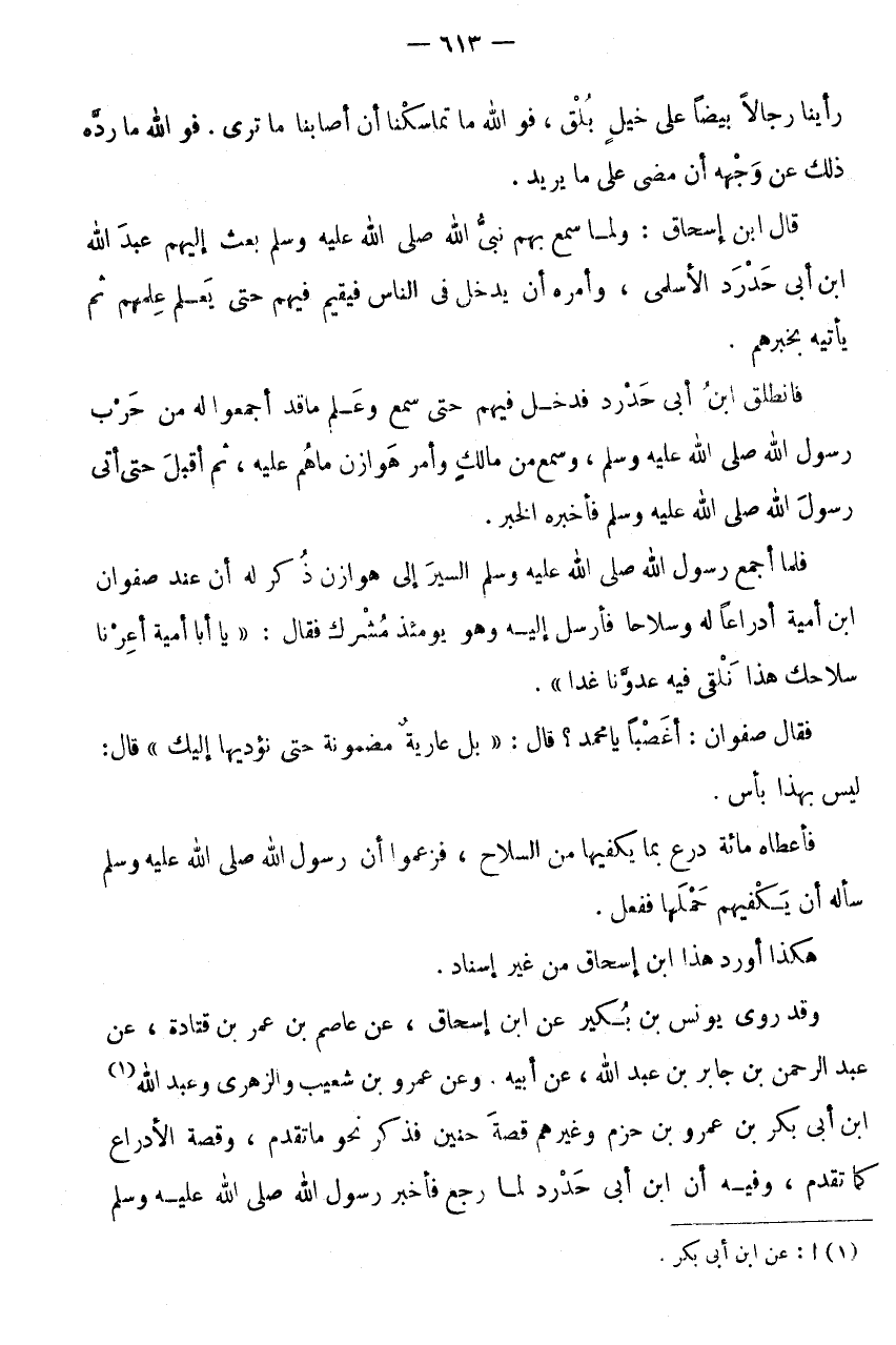 وَقَدْ رَوَى يُونُسَ بْنِ بُكَيْرٍ عَنِ ابْنِ إِسْحَاقَ، عَنْ عَاصِمِ بْنِ عُمَرَ بن قَتَادَة، عَن عَبْدِ الرَّحْمَنِ بْنِ جَابِرِ بْنِ عَبْدِ اللَّهِ، عَنْ أَبِيهِ، وَعَنْ عَمْرِو بْنِ شُعَيْبٍ وَالزُّهْرِيِّ وَعَبْدِ الله (1) ابْن أَبِي بَكْرِ بْنِ عَمْرِو بْنِ حَزْمٍ وَغَيْرِهِمْ قِصَّةَ حُنَيْنٍ فَذَكَرَ نَحْوَ مَا تَقَدَّمَ، وَقِصَّةَ الْأَدْرَاعِ كَمَا تَقَدَّمَ، وَفِيهِ أَنَّ ابْنَ أَبِي حَدْرَدٍ لَمَّا رَجَعَ فَأَخْبَرَ رَسُولَ اللَّهِ صَلَّى اللَّهُ عَلَيْهِ وَسَلَّمَ