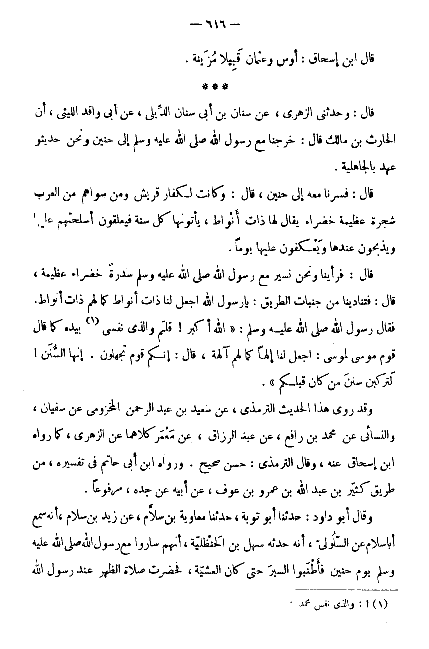 قَالَ: فَسِرْنَا مَعَهُ إِلَى حُنَيْنٍ، قَالَ: وَكَانَتْ لِكُفَّارِ قُرَيْشٍ وَمَنْ سِوَاهُمْ مِنَ الْعَرَبِ شَجَرَةٌ عَظِيمَةٌ خَضْرَاءُ يُقَالُ لَهَا ذَاتُ أَنْوَاطٍ، يَأْتُونَهَا كُلَّ سَنَةٍ فَيُعَلِّقُونَ أَسْلِحَتَهُمْ عَلَيْهَا وَيَذْبَحُونَ عِنْدَهَا وَيَعْكُفُونَ عَلَيْهَا يَوْمًا.
