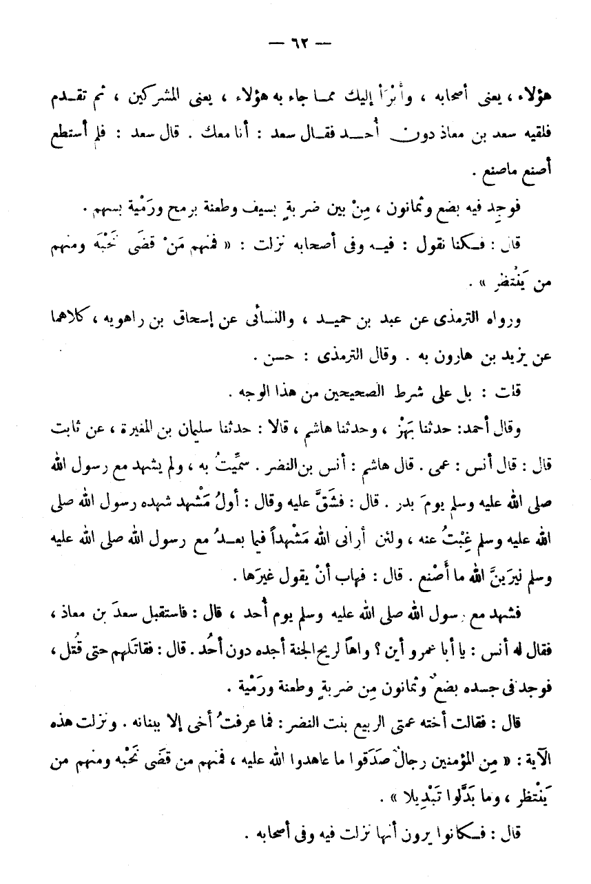 وَنَزَلَتْ هَذِهِ الْآيَةُ: " مِنَ الْمُؤْمِنِينَ رِجَالٌ صَدَقُوا مَا عَاهَدُوا اللَّهَ عَلَيْهِ، فَمِنْهُمْ مَنْ قَضَى نَحْبَهُ وَمِنْهُمْ مَنْ يَنْتَظِرُ، وَمَا بدلُوا تبديلا ".