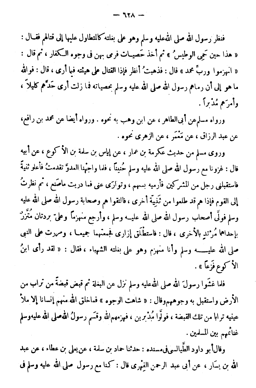 فَنَظَرَ رَسُولُ اللَّهِ صَلَّى اللَّهُ عَلَيْهِ وَسَلَّمَ وَهُوَ عَلَى بَغْلَتِهِ كَالْمُتَطَاوِلِ عَلَيْهَا إِلَى قِتَالِهِمْ فَقَالَ: " هَذَا حِينُ حَمِيَ الْوَطِيسُ " ثُمَّ أَخَذَ حَصَيَاتٍ فَرَمَى بِهِنَّ فِي وُجُوهِ الْكُفَّارِ، ثُمَّ قَالَ: " انْهَزَمُوا وَرَبِّ مُحَمَّدٍ " قَالَ: فَذَهَبْتُ أَنْظُرُ فَإِذَا الْقِتَالُ عَلَى هَيْئَتِهِ فِيمَا أَرَى، قَالَ: فوَاللَّه مَا هُوَ إِلَى أَنْ رَمَاهُمْ رَسُولُ اللَّهِ صَلَّى اللَّهُ عَلَيْهِ وَسَلَّمَ بِحَصَيَاتِهِ فَمَا زِلْتُ أَرَى حَدَّهُمْ كَلِيلًا، وَأَمْرَهُمْ مُدْبِرًا.