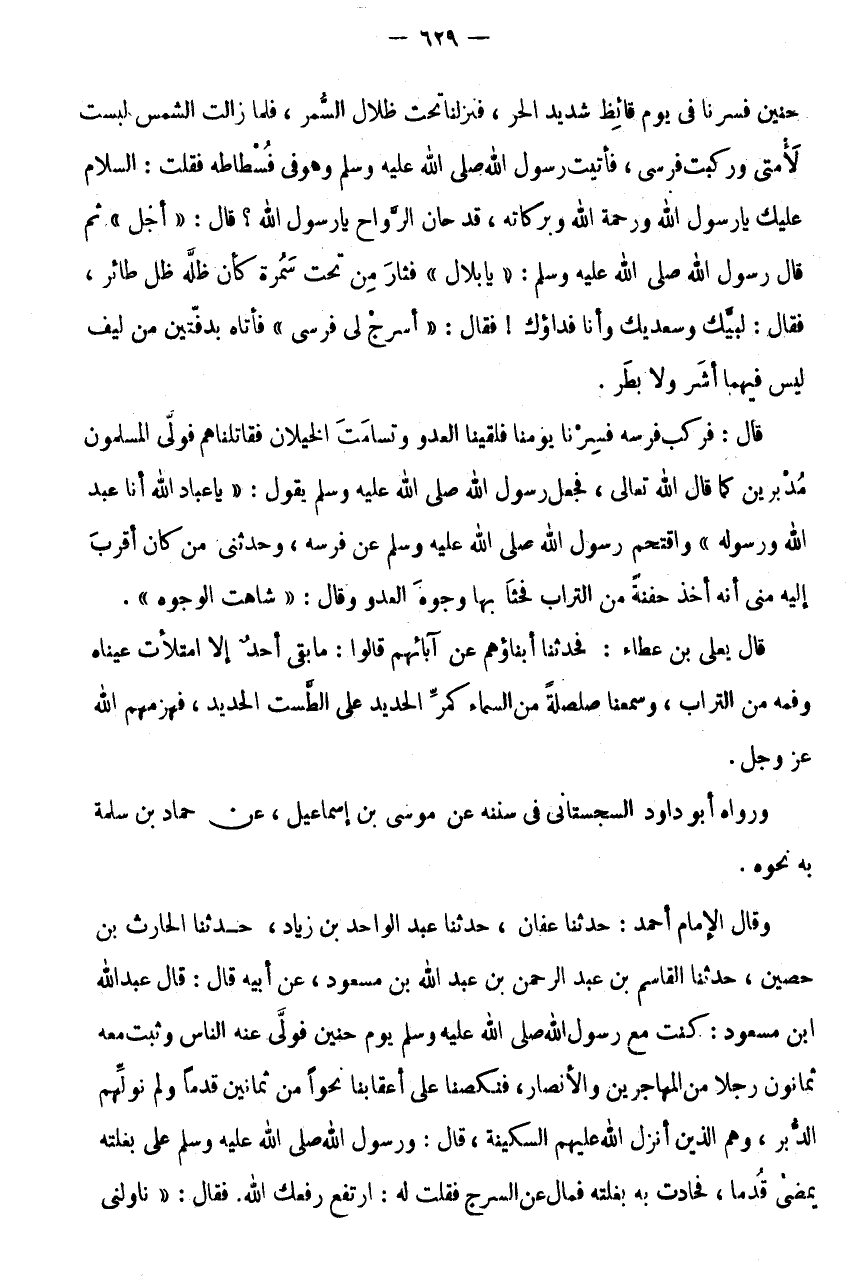ابْن مَسْعُودٍ: كُنْتُ مَعَ رَسُولِ اللَّهِ صَلَّى اللَّهُ عَلَيْهِ وَسَلَّمَ يَوْمَ حُنَيْنٍ فَوَلَّى عَنْهُ النَّاسُ وَثَبَتَ مَعَهُ ثَمَانُونَ رَجُلًا مَنَ الْمُهَاجِرِينَ وَالْأَنْصَارِ، فنكصنا على أعقابنا نَحْوًا مِنْ ثَمَانِينَ قَدَمًا وَلَمْ نُوَلِّهِمُ الدُّبُرَ، وَهُمُ الَّذِينَ أَنْزَلَ اللَّهُ عَلَيْهِمُ السِّكِّينَةَ، قَالَ: وَرَسُولُ اللَّهِ صَلَّى اللَّهُ عَلَيْهِ وَسَلَّمَ عَلَى بَغْلَتِهِ يَمْضِي قُدُمًا، فَحَادَتْ بِهِ بَغْلَتُهُ فَمَالَ عَنِ السَّرْجِ فَقُلْتُ لَهُ: ارْتَفِعْ رَفْعَكَ اللَّهُ.