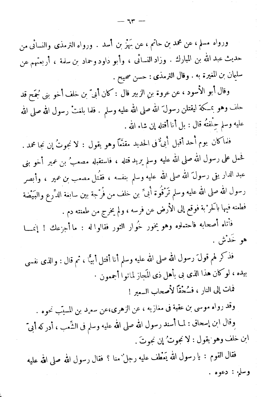 فَحَمَلَ عَلَى رَسُولِ اللَّهِ صَلَّى اللَّهُ عَلَيْهِ وَسَلَّمَ يُرِيدُ قَتْلَهُ، فَاسْتَقْبَلَهُ مُصْعَبُ بْنُ عُمَيْرٍ أَخُو بَنِي عَبْدِ الدَّارِ يَقِي رَسُولَ اللَّهِ صَلَّى اللَّهُ عَلَيْهِ وَسَلَّمَ بِنَفْسِهِ، فَقُتِلَ مُصْعَبُ بْنُ عُمَيْرٍ، وَأَبْصَرَ رَسُولُ اللَّهِ صَلَّى اللَّهُ عَلَيْهِ وَسَلَّمَ تَرْقُوَةَ أُبَيِّ بْنِ خَلَفٍ مِنْ فُرْجَةٍ بَيْنَ سَابِغَةِ الدِّرْعِ والبيضة فطعنه فِيهَا بالحربة فَوَقَعَ إِلَى الْأَرْضِ عَنْ فَرَسِهِ، وَلَمْ يَخْرُجْ مِنْ طَعْنَتِهِ دَمٌ.