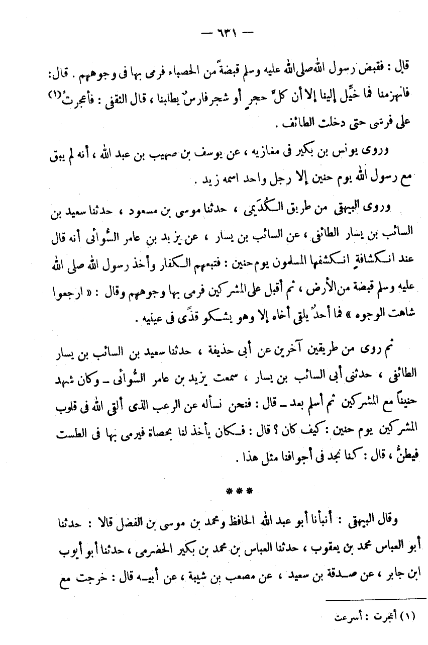 وروى البيهقى من طَرِيق الكديمى، حَدثنَا مُوسَى بن مَسْعُود، حَدثنَا سَعِيدُ بْنُ السَّائِبِ بْنِ يَسَارٍ الطَّائِفِيُّ، عَنِ السَّائِبِ بْنِ يَسَارٍ، عَنْ يَزِيدَ بْنِ عَامِرٍ السُّوَائِيِّ أَنَّهُ قَالَ عِنْدَ انْكِشَافَةٍ انْكَشَفَهَا الْمُسْلِمُونَ يَوْمَ حُنَيْنٍ: فَتَبِعَهُمُ الْكُفَّارُ وَأَخَذَ رَسُولُ اللَّهِ صَلَّى اللَّهُ عَلَيْهِ وَسَلَّمَ قَبْضَةً مِنَ الْأَرْضِ، ثُمَّ أَقْبَلَ عَلَى الْمُشْرِكِينَ فَرَمَى بِهَا وُجُوهَهُمْ وَقَالَ: " ارْجِعُوا شَاهَتِ الْوُجُوهُ " فَمَا أَحَدٌ يَلْقَى أَخَاهُ إِلَّا وَهُوَ يَشْكُو قَذًى فِي عَيْنَيْهِ.
