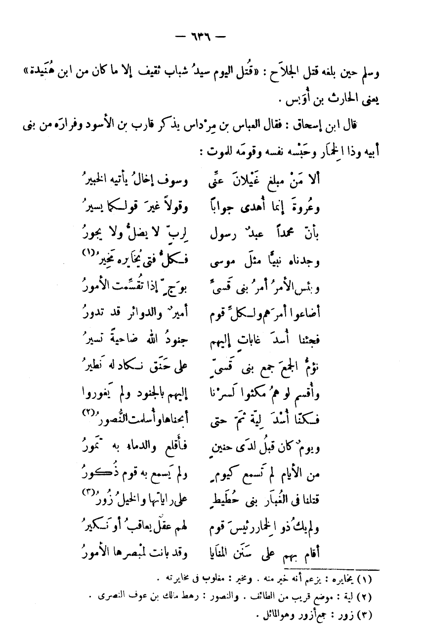 قَالَ ابْنُ إِسْحَاقَ: فَقَالَ الْعَبَّاسُ بْنُ مِرْدَاسٍ يَذْكُرُ قَارِبَ بْنَ الْأَسْوَدِ وَفِرَارَهُ مِنْ بَنِي أَبِيهِ وَذَا الْخِمَارِ وَحَبْسَهُ نَفْسَهُ وَقَوْمَهُ لِلْمَوْتِ: أَلَا مَنْ مُبْلِغٌ غَيْلَانَ عَنِّي * وَسَوْفَ إِخَالُ يَأْتِيهِ الْخَبِيرُ وَعُرْوَةَ إِنَّمَا أُهْدِي جَوَابًا * وَقَوْلًا غَيْرَ قَوْلِكَمَا يَسِيرُ بِأَنَّ مُحَمَّدًا عَبْدٌ رَسُولٌ * لِرَبٍّ لَا يَضِلُّ وَلَا يَجُورُ وَجَدْنَاهُ نَبِيًّا مِثْلَ مُوسَى * فَكُلُّ فَتًى يُخَايِرُهُ مَخِيرُ (1) وَبِئْسَ الامر أَمر بنى قسى * بوج إِذا تُقُسِّمَتِ الْأُمُورُ أَضَاعُوا أَمْرَهُمْ وَلِكُلِّ قَوْمٍ * أَمِيرٌ وَالدَّوَائِرُ قَدْ تَدُورُ فَجِئْنَا أُسْدَ غَابَاتٍ إِلَيْهِمْ * جُنُودُ اللَّهِ ضَاحِيَةً تَسِيرُ نَؤُمُّ الْجَمْعَ جَمْعَ بَنِي قَسِيٍّ * عَلَى حَنَقٍ نَكَادُ لَهُ نَطِيرُ وَأُقْسِمُ لَوْ هُمُ مَكَثُوا لَسِرْنَا * إِلَيْهِمْ بِالْجُنُودِ وَلَمْ يَغُورُوا فَكُنَّا أُسْدَ لِيَّةَ ثُمَّ حَتَّى * أَبَحْنَاهَا وَأَسْلَمَتِ النُّصُورُ (2) وَيَوْمٌ كَانَ قَبْلُ لَدَى حُنَيْنٍ * فَأَقْلَعَ وَالدِّمَاءُ بِهِ تَمُورُ مِنَ الْأَيَّامِ لَمْ تَسْمَعْ كَيَوْمٍ * وَلَمْ يَسْمَعْ بِهِ قَوْمٌ ذُكُورُ قَتَلْنَا فِي الْغُبَارِ بَنِي حُطَيْطٍ * عَلَى رَايَاتِهَا وَالْخَيْلُ زُورٌ (3) وَلَمْ يَكُ ذُو الْخِمَارِ رَئِيسَ قَوْمٍ * لَهُمْ عَقْلٌ يُعَاقِبُ أَوْ نَكِيرُ أَقَامَ بِهِمْ عَلَى سَنَنِ الْمَنَايَا * وَقَدْ بَانَتْ لمبصرها الامور