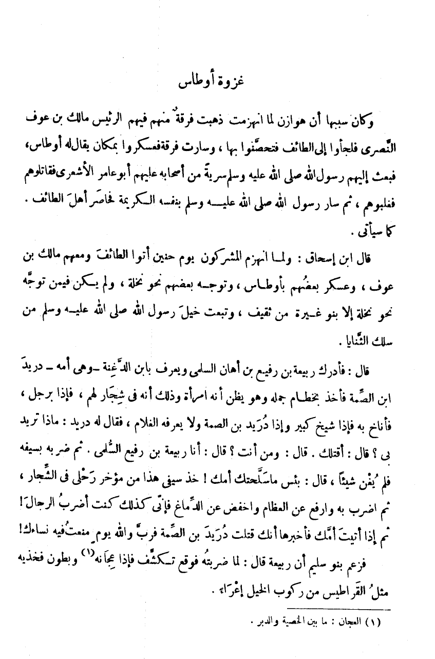 غَزْوَة أَوْطَاسٍ وَكَانَ سَبَبُهَا أَنَّ هَوَازِنَ لَمَّا انْهَزَمَتْ ذَهَبَتْ فِرْقَةٌ مِنْهُمْ فِيهِمُ الرَّئِيسُ مَالِكُ بْنُ عَوْف النصرى فلجأوا إِلَى الطَّائِفِ فَتَحَصَّنُوا بِهَا، وَسَارَتْ فِرْقَةٌ فَعَسْكَرُوا بِمَكَانٍ يُقَالُ لَهُ أَوَطَاسٌ، فَبَعَثَ إِلَيْهِمْ رَسُولُ اللَّهِ صَلَّى اللَّهُ عَلَيْهِ وَسَلَّمَ سَرِيَّةً مِنْ أَصْحَابِهِ عَلَيْهِمْ أَبُو عَامِرٍ الْأَشْعَرِيُّ فَقَاتَلُوهُمْ فَغَلَبُوهُمْ، ثُمَّ سَارَ رَسُولُ اللَّهِ صَلَّى اللَّهُ عَلَيْهِ وَسَلَّمَ بِنَفْسِهِ الْكَرِيمَةِ فَحَاصَرَ أَهْلَ الطَّائِفِ.
