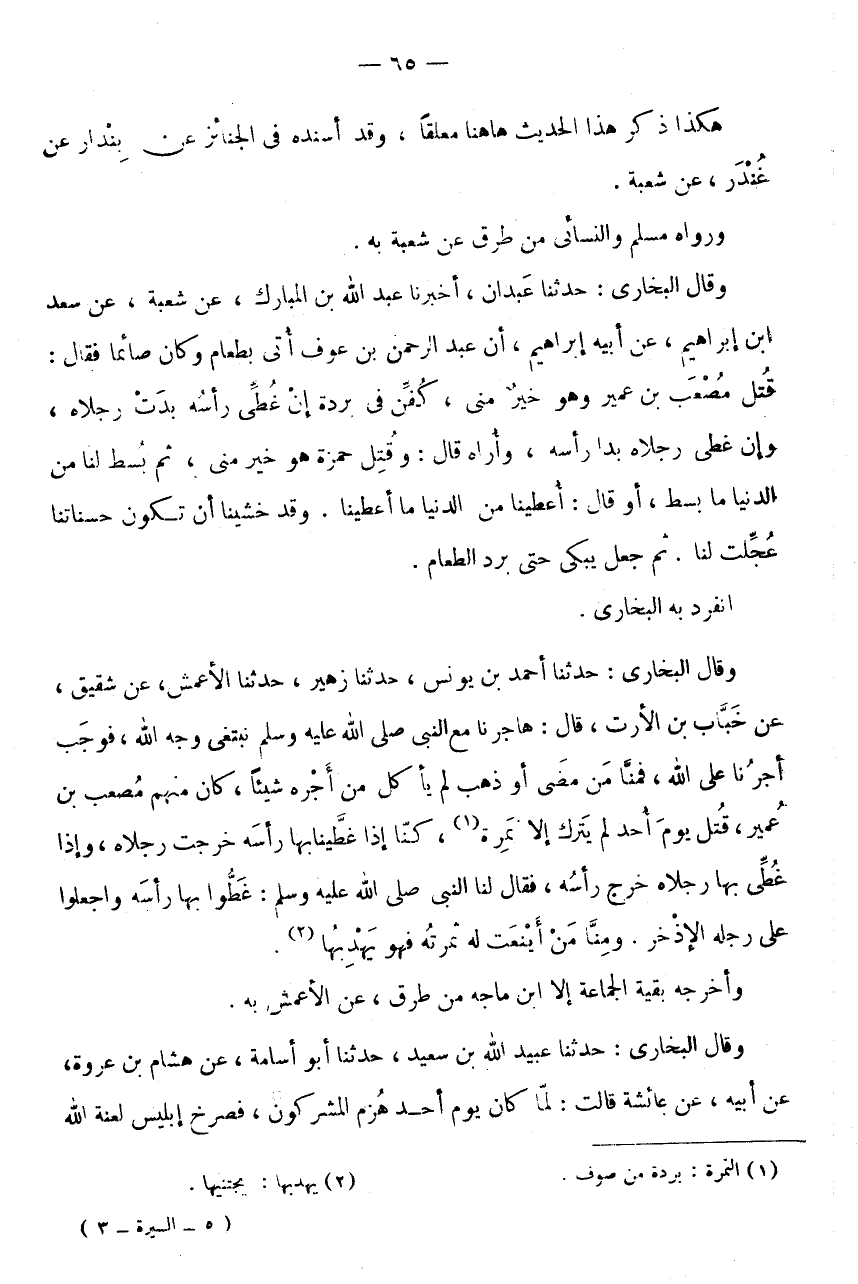 وَقَالَ الْبُخَارِيُّ: حَدَّثَنَا أَحْمَدُ بْنُ يُونُسَ، حَدَّثَنَا زُهَيْرٌ، حَدَّثَنَا الْأَعْمَشُ، عَنْ شَقِيقٍ، عَنْ خَبَّابِ بْنِ الْأَرَتِّ، قَالَ: هَاجَرْنَا مَعَ النَّبِيِّ صَلَّى اللَّهُ عَلَيْهِ وَسَلَّمَ نَبْتَغِي وَجْهَ اللَّهِ، فَوَجَبَ أَجْرُنَا عَلَى اللَّهِ، فَمِنَّا مَنْ مَضَى أَوْ ذَهَبَ لَمْ يَأْكُلْ مِنْ أَجْرِهِ شَيْئًا، كَانَ مِنْهُمْ مُصْعَبُ بْنُ عُمَيْرٍ، قُتِلَ يَوْمَ أُحُدٍ لَمْ يَتْرُكْ إِلَّا نَمِرَةً (1) ، كُنَّا إِذَا غَطَّيْنَا بِهَا رَأْسَهُ خَرَجَتْ رِجْلَاهُ، وَإِذَا غُطِّيَ بِهَا رِجْلَاهُ خَرَجَ رَأْسُهُ، فَقَالَ لَنَا النَّبِيُّ صَلَّى اللَّهُ عَلَيْهِ وَسَلَّمَ: غَطُّوا بِهَا رَأْسَهُ وَاجْعَلُوا عَلَى رِجْلِهِ الْإِذْخِرَ.