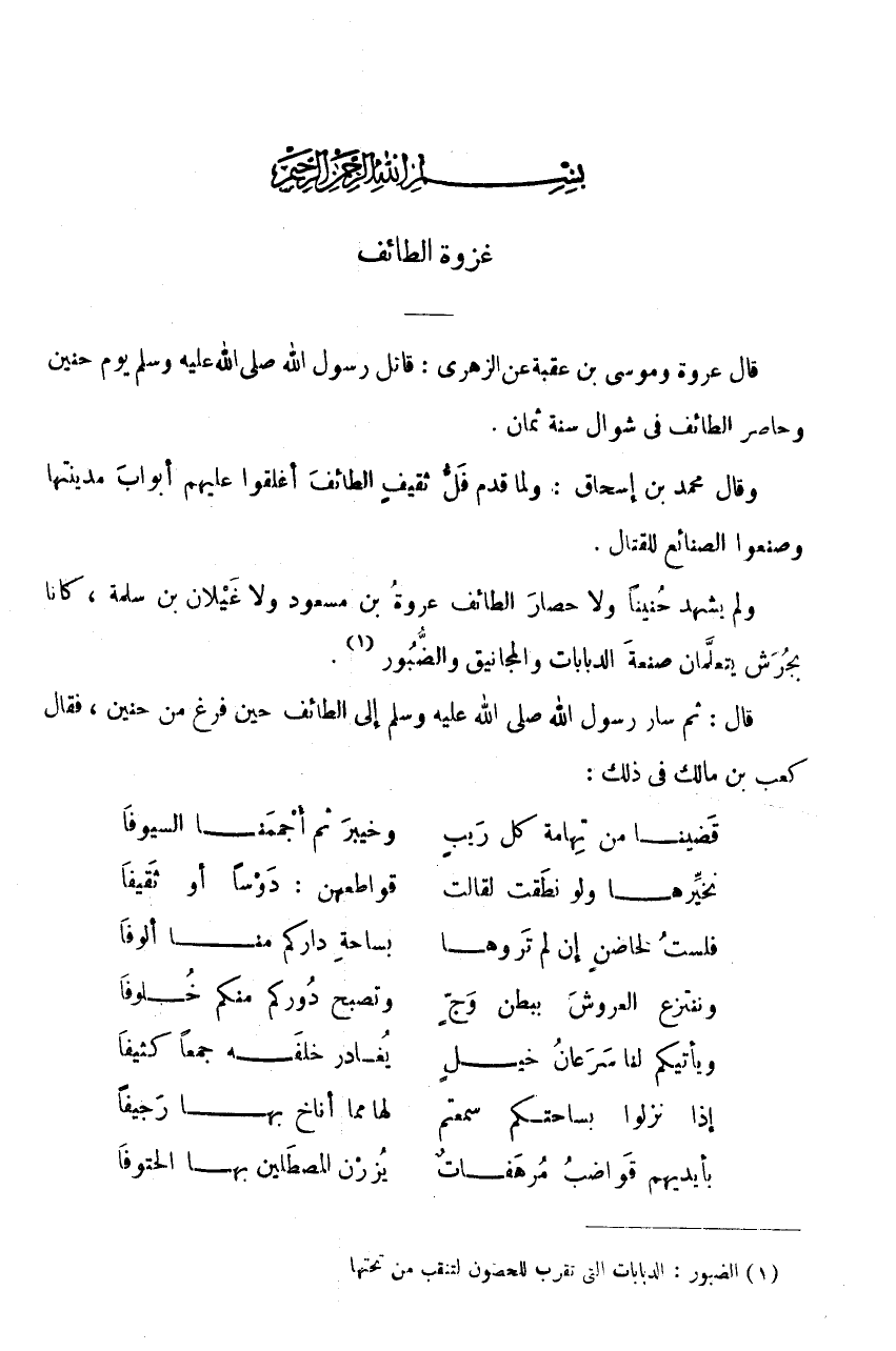 قَالَ: ثُمَّ سَارَ رَسُولُ اللَّهِ صَلَّى اللَّهُ عَلَيْهِ وَسَلَّمَ إِلَى الطَّائِفِ حِينَ فَرَغَ مِنْ حُنَيْنٍ، فَقَالَ كَعْبُ بْنُ مَالِكٍ فِي ذَلِكَ: قَضَيْنَا مِنْ تِهَامَةَ كُلَّ رَيْبٍ * وَخَيْبَرَ ثُمَّ أَجْمَمْنَا السُّيُوفَا نُخَيِّرُهَا وَلَوْ نَطَقَتْ لَقَالَتْ * قَوَاطِعُهُنَّ: دَوْسًا أَوْ ثَقِيفَا فَلَسْتُ لِحَاضِنٍ إِنْ لَمْ تَرَوْهَا * بِسَاحَةِ دَارِكُمْ مِنَّا أُلُوفَا وَنَنْتَزِعُ الْعُرُوشَ بِبَطْنِ وَجٍّ * وَتُصْبِحُ دُورُكُمْ مِنْكُمْ خُلُوفَا وَيَأْتِيكُمْ لَنَا سَرْعَانُ خَيْلٍ * يُغَادِرُ خَلْفَهُ جَمْعًا كَثِيفَا إِذَا نَزَلُوا بِسَاحَتِكُمْ سَمِعْتُمْ * لَهَا مَمَّا أَنَاخَ بَهَا رَجِيفَا بِأَيْدِيهِمْ قَوَاضِبُ مُرْهَفَاتٌ * يُزِرْنَ المصطلين بهَا الحتوفا