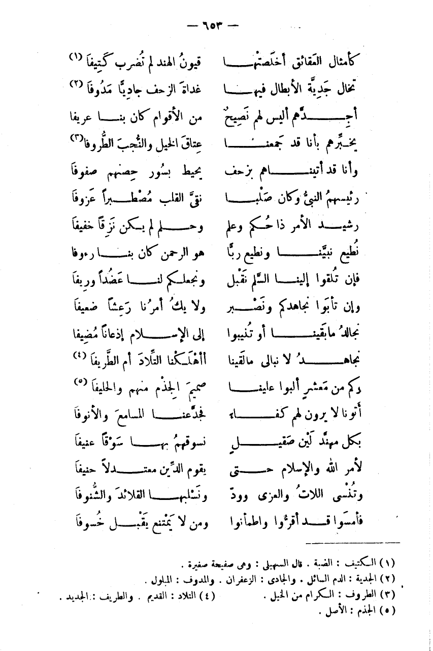 كَأَمْثَالِ الْعَقَائِقِ أَخْلَصَتْهَا * قُيُونُ الْهِنْدِ لَمْ تُضْرَبْ كَتِيفَا (1) تَخَالُ جَدِيَّةَ الْأَبْطَالِ فِيهَا * غَدَاةَ الزَّحْفِ جَادِيًّا مَدُوفَا (2) أَجَدَّهُمُ أَلَيْسَ لَهُمْ نَصِيحٌ * مِنَ الْأَقْوَامِ كَانَ بِنَا عَرِيفَا يُخَبِّرُهُمْ بِأَنَّا قَدْ جَمَعْنَا * عِتَاقَ الْخَيْلِ وَالنُّجُبَ الطُّرُوفَا (3) وَأَنَّا قَدْ أَتَيْنَاهُمْ بِزَحْفٍ * يُحِيطُ بِسُورِ حِصْنِهِمُ صُفُوفَا رَئِيسُهُمُ النَّبِي وَكَانَ صلبا * نقى الْقلب مصطبرا عزوفا رَشِيدَ الْأَمْرِ ذَا حُكْمٍ وَعِلْمٍ * وَحِلْمٍ لَمْ يَكُنْ نَزِقًا خَفِيفَا نُطِيعُ نَبِيَّنَا وَنُطِيعُ رَبًّا * هُوَ الرَّحْمَن كَانَ بِنَا رؤوفا فَإِنْ تُلْقُوا إِلَيْنَا السِّلْمَ نَقْبَلْ * وَنَجْعَلْكُمْ لَنَا عَضُدًا وَرِيفَا وَإِنْ تَأْبَوْا نُجَاهِدْكُمْ وَنَصْبِرْ * وَلَا يَكُ أَمْرُنَا رَعِشًا ضَعِيفَا نُجَالِدُ مَا بَقِينَا أَوْ تُنِيبُوا * إِلَى الْإِسْلَامِ إِذْعَانًا مُضِيفَا نُجَاهِدُ لَا نُبَالِي مَا لَقِينَا * أَأَهْلَكْنَا التِّلَادَ أَمِ الطَّرِيفَا (4) وَكَمْ مِنْ مَعْشَرٍ أَلَبُوا عَلَيْنَا * صَمِيمَ الْجِذْمِ مِنْهُمْ وَالْحَلِيفَا (5) أَتَوْنَا لَا يَرَوْنَ لَهُمْ كِفَاءً * فَجَدَّعْنَا الْمَسَامِعَ وَالْأُنُوفَا بِكُلِّ مُهَنَّدٍ لَيْنٍ صَقِيلٍ * نَسُوقُهُمُ بِهَا سَوْقًا عَنِيفَا لِأَمْرِ اللَّهِ وَالْإِسْلَامِ حَتَّى * يَقُومَ الدِّينُ مُعْتَدِلًا حَنِيفَا وَتُنْسَى اللَّاتُ وَالْعُزَّى وَوُدٌّ * وَنَسْلُبَهَا الْقَلَائِدَ وَالشُّنُوفَا فَأَمْسَوْا قَدْ أَقَرُّوا وَاطْمَأَنُّوا * وَمَنْ لَا يَمْتَنِعْ يَقْبَلْ خسوفا