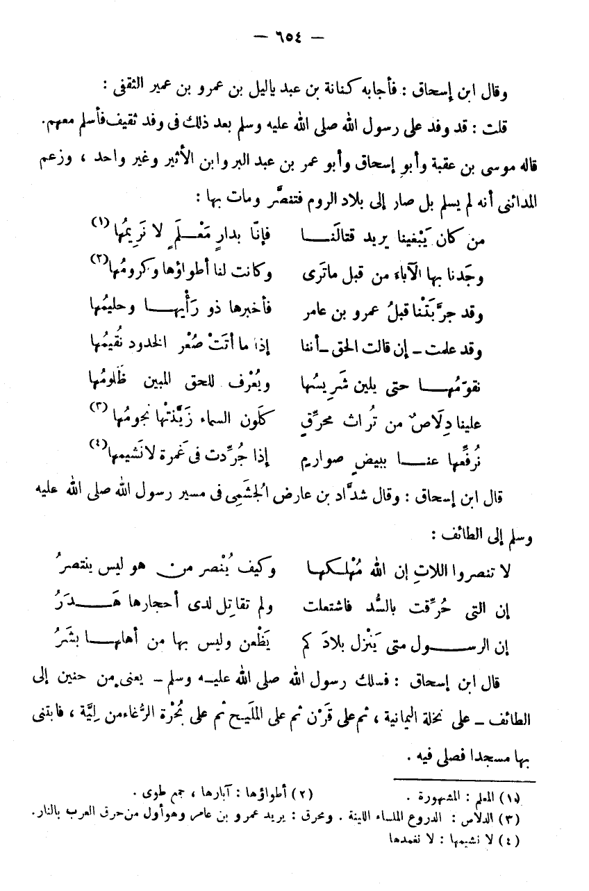 قَالَه مُوسَى بن عقبَة وَأَبُو إِسْحَاقَ وَأَبُو عُمَرَ بْنُ عَبْدِ الْبَرِّ وَابْنُ الْأَثِيرِ وَغَيْرُ وَاحِدٍ، وَزَعَمَ الْمَدَائِنِيُّ أَنَّهُ لَمْ يُسْلِمْ بَلْ صَارَ إِلَى بِلَادِ الرُّومِ فَتَنَصَّرَ وَمَات بهَا: من كَانَ يَبْغِينَا يُرِيدُ قِتَالَنَا * فَإِنَّا بِدَارٍ مَعْلَمٍ لَا نَرِيمُهَا (1) وَجَدْنَا بِهَا الْآبَاءَ مِنْ قَبْلِ مَا تَرَى * وَكَانَتْ لَنَا أَطْوَاؤُهَا وَكُرُومُهَا (2) وَقَدْ جَرَّبَتْنَا قَبْلُ عَمْرُو بْنُ عَامِرٍ * فَأَخْبَرَهَا ذُو رَأْيِهَا وَحَلِيمُهَا وَقَدْ عَلِمَتْ - إِنْ قَالَتِ الْحَقَّ - أننا * إِذا مَا أَتَت صُعْرُ الْخُدُودِ نُقِيمُهَا نُقَوِّمُهَا حَتَّى يَلِينَ شَرِيسُهَا * وَيُعْرَفَ لِلْحَقِّ الْمُبِينِ ظَلُومُهَا عَلَيْنَا دِلَاصٌ مِنْ تُرَاثِ مُحَرِّقٍ * كَلَوْنِ السَّمَاءِ زَيَّنَتْهَا نُجُومُهَا (3) نُرَفِّعُهَا عَنَّا بِبِيضٍ صَوَارِمَ * إِذَا جُرِّدَتْ فِي غَمْرَةٍ لَا نَشِيمُهَا (4) قَالَ ابْنُ إِسْحَاقَ: وَقَالَ شَدَّادُ بْنُ عَارَضٍ الْجُشَمِيُّ فِي مَسِيرِ رَسُولِ اللَّهِ صَلَّى اللَّهُ عَلَيْهِ وَسَلَّمَ إِلَى الطَّائِفِ: لَا تَنْصُرُوا اللَّاتَ إِنَّ اللَّهَ مُهْلِكُهَا * وَكَيْفَ يُنْصَرُ مَنْ هُوَ لَيْسَ يَنْتَصِرُ إِنَّ الَّتِي حُرِّقَتْ بِالسُّدِّ فَاشْتَعَلَتْ * وَلَمْ تُقَاتِلْ لَدَى أَحْجَارِهَا هَدَرُ إِنَّ الرَّسُولَ مَتَى يَنْزِلْ بِلَادَكُمُ * يَظْعَنْ وَلَيْسَ بِهَا مِنْ أَهْلِهَا بَشَرُ قَالَ ابْنُ إِسْحَاقَ: فَسَلَكَ رَسُولَ اللَّهِ صَلَّى اللَّهُ عَلَيْهِ وَسَلَّمَ - يَعْنِي مِنْ حُنَيْنٍ إِلَى الطَّائِفِ - عَلَى نَخْلَةَ الْيَمَانِيَّةِ، ثُمَّ عَلَى قَرْنٍ ثُمَّ عَلَى الْمُلَيْحِ ثُمَّ عَلَى بَحْرَةِ الرُّغَاءِ مِنْ لِيَّةَ، فَابْتَنَى بهَا مَسْجِدا فصلى فِيهِ.