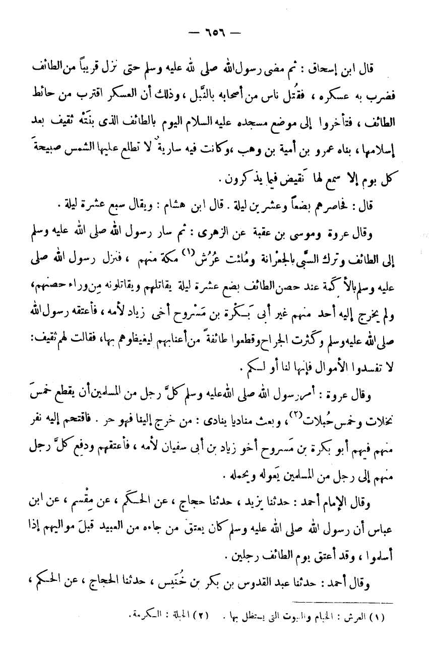 وَقَالَ عُرْوَةُ وَمُوسَى بْنُ عُقْبَةَ عَنِ الزُّهْرِيِّ: ثُمَّ سَارَ رَسُولُ اللَّهِ صَلَّى اللَّهُ عَلَيْهِ وَسَلَّمَ إِلَى الطَّائِفِ وَتَرَكَ السَّبْيَ بِالْجِعْرَانَةِ وَمُلِئَتْ عُرُشُ (1) مَكَّة مِنْهُم، فَنزل رَسُول الله صلى عَلَيْهِ وَسَلَّمَ بِالْأَكَمَةِ عِنْدَ حِصْنِ الطَّائِفِ بِضْعَ عَشْرَةَ لَيْلَةً يُقَاتِلُهُمْ وَيُقَاتِلُونَهُ مِنْ وَرَاءِ حِصْنِهِمْ، وَلَمْ يَخْرُجْ إِلَيْهِ أَحَدٌ مِنْهُمْ غَيْرُ أَبِي بَكْرَةَ بْنِ مَسْرُوحٍ أَخِي زِيَادٍ لِأُمِّهِ، فَأَعْتَقَهُ رَسُولُ اللَّهِ صَلَّى اللَّهُ عَلَيْهِ وَسَلَّمَ وَكَثُرَتِ الْجراح وَقَطعُوا طَائِفَة من أعنابهم لِيُغِيظُوهُمْ بِهَا، فَقَالَتْ لَهُمْ ثَقِيفٌ: لَا تُفْسِدُوا الْأَمْوَالَ فَإِنَّهَا لَنَا أَوْ لَكُمْ.