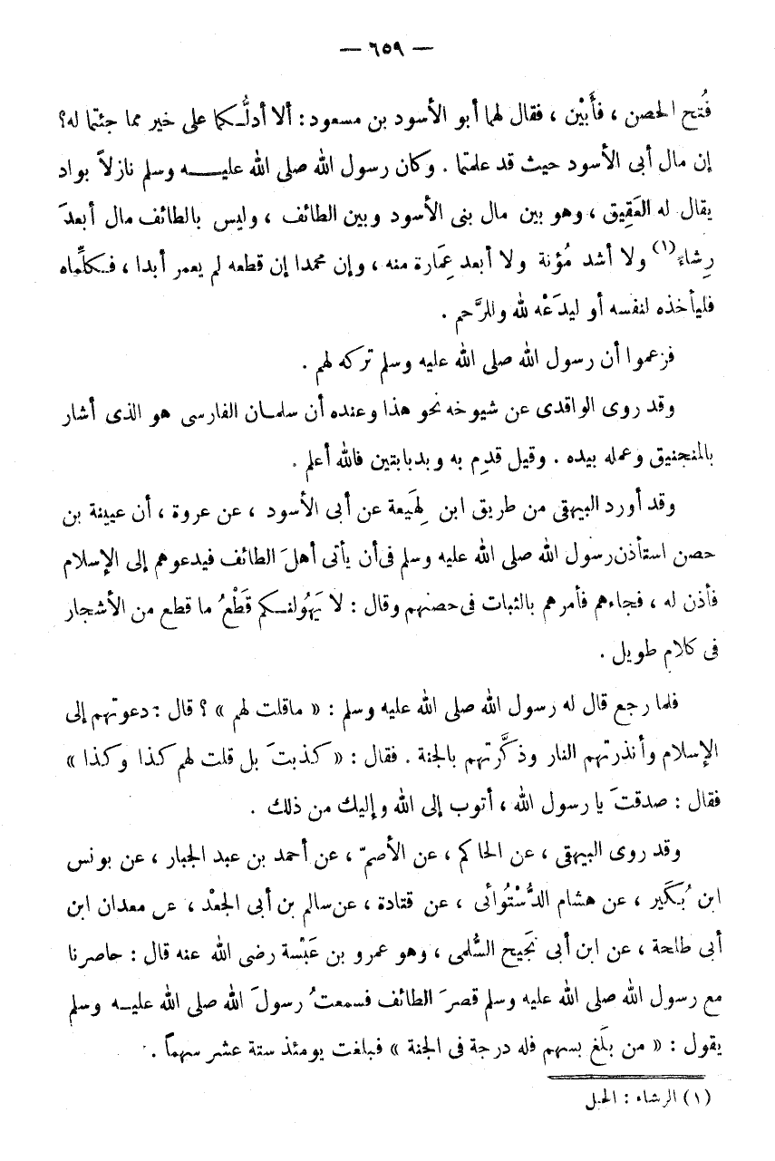 وَكَانَ رَسُولُ اللَّهِ صَلَّى اللَّهُ عَلَيْهِ وَسَلَّمَ نَازِلًا بِوَادٍ يُقَالُ لَهُ الْعَقِيقُ، وَهُوَ بَيْنَ مَالِ بَنِي الْأَسْوَدِ وَبَيْنَ الطَّائِفِ، وَلَيْسَ بِالطَّائِفِ مَالٌ أَبْعَدَ رِشَاءً (1) وَلَا أَشد مُؤنَة وَلَا أَبْعَدَ عِمَارَةً مِنْهُ، وَإِنَّ مُحَمَّدًا إِنْ قَطَّعَهُ لَمْ يَعْمُرْ أَبَدًا، فَكَلِّمَاهُ فَلْيَأْخُذْهُ لِنَفْسِهِ أَوْ لِيَدَعْهُ لِلَّهِ وَلِلرَّحِمِ.