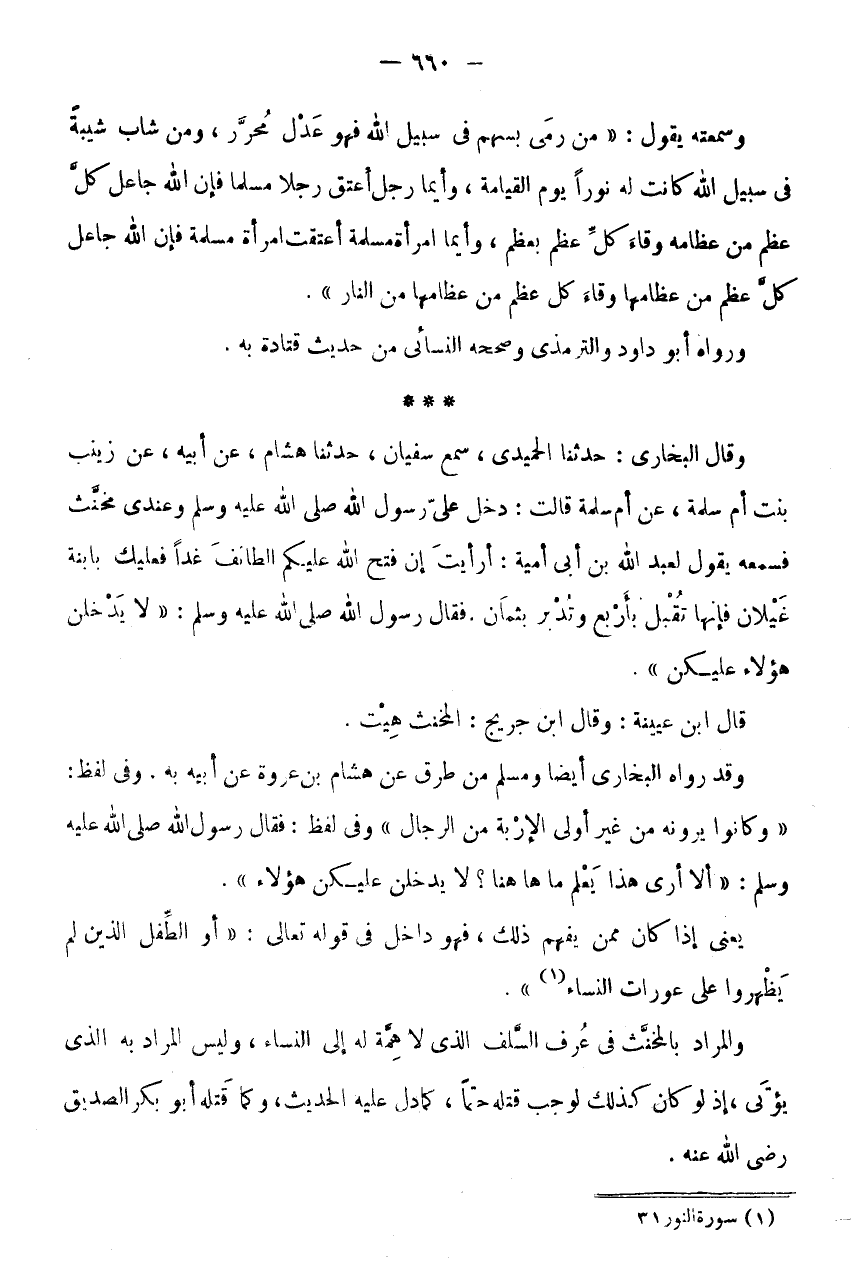 * * * وَقَالَ البُخَارِيّ: حَدثنَا الحميدى، سمع سُفْيَان، حَدثنَا هِشَامٌ، عَنْ أَبِيهِ، عَنْ زَيْنَبَ بِنْتِ أُمِّ سَلَمَةَ، عَنْ أُمِّ سَلَمَةَ قَالَتْ: دَخَلَ عَلَى رَسُولِ اللَّهِ صَلَّى اللَّهُ عَلَيْهِ وَسَلَّمَ وَعِنْدِي مخنث فَسَمعهُ يَقُولُ لِعَبْدِ اللَّهِ بْنِ أَبِي أُمَيَّةَ: أَرَأَيْتَ إِنْ فَتَحَ اللَّهُ عَلَيْكُمُ الطَّائِفَ غَدًا فَعَلَيْكَ بِابْنَةِ غَيْلَانَ فَإِنَّهَا تُقْبِلُ بِأَرْبَعٍ وَتُدْبِرُ بِثَمَانٍ.