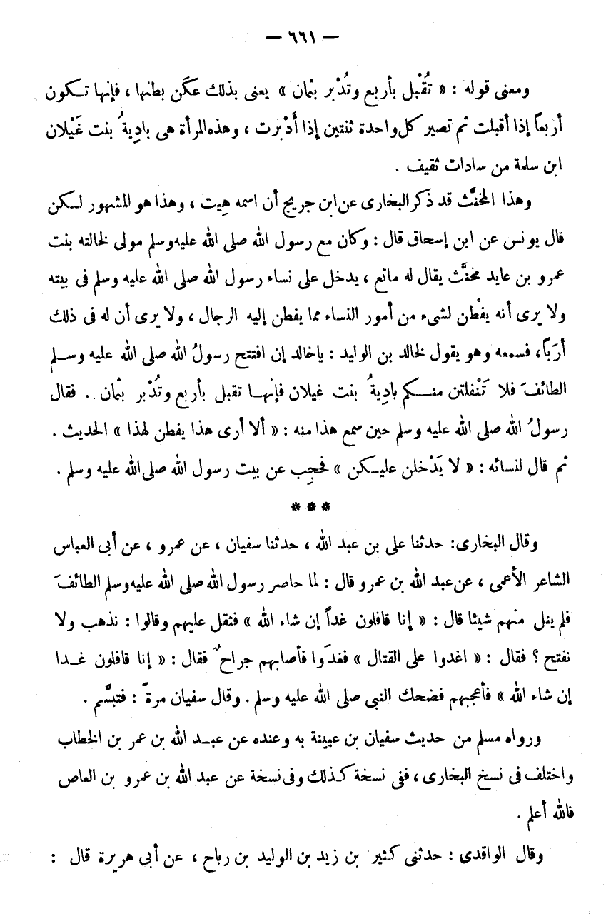 * * * وَقَالَ الْبُخَارِيُّ: حَدَّثَنَا عَلِيُّ بْنُ عَبْدِ اللَّهِ، حَدَّثَنَا سُفْيَانُ، عَنْ عَمْرٍو، عَنْ أَبِي الْعَبَّاسِ الشَّاعِرِ الْأَعْمَى، عَنْ عَبْدِ اللَّهِ بْنِ عَمْرٍو قَالَ: لَمَّا حَاصَرَ رَسُولُ اللَّهِ صَلَّى اللَّهُ عَلَيْهِ وَسَلَّمَ الطَّائِفَ فَلَمْ يَنَلْ مِنْهُمْ شَيْئًا قَالَ: " إِنَّا قَافِلُونَ غَدًا إِنْ شَاءَ اللَّهُ " فَثَقُلَ عَلَيْهِم وَقَالُوا: نَذْهَب وَلَا نفتح؟ فَقَالَ: " اغْدُوا عَلَى الْقِتَالِ " فَغَدَوْا فَأَصَابَهُمْ جِرَاحٌ فَقَالَ: " إِنَّا قَافِلُونَ غَدًا إِنْ شَاءَ اللَّهُ " فَأَعْجَبَهُمْ فَضَحِكَ النَّبِيُّ صَلَّى اللَّهُ عَلَيْهِ وَسَلَّمَ.