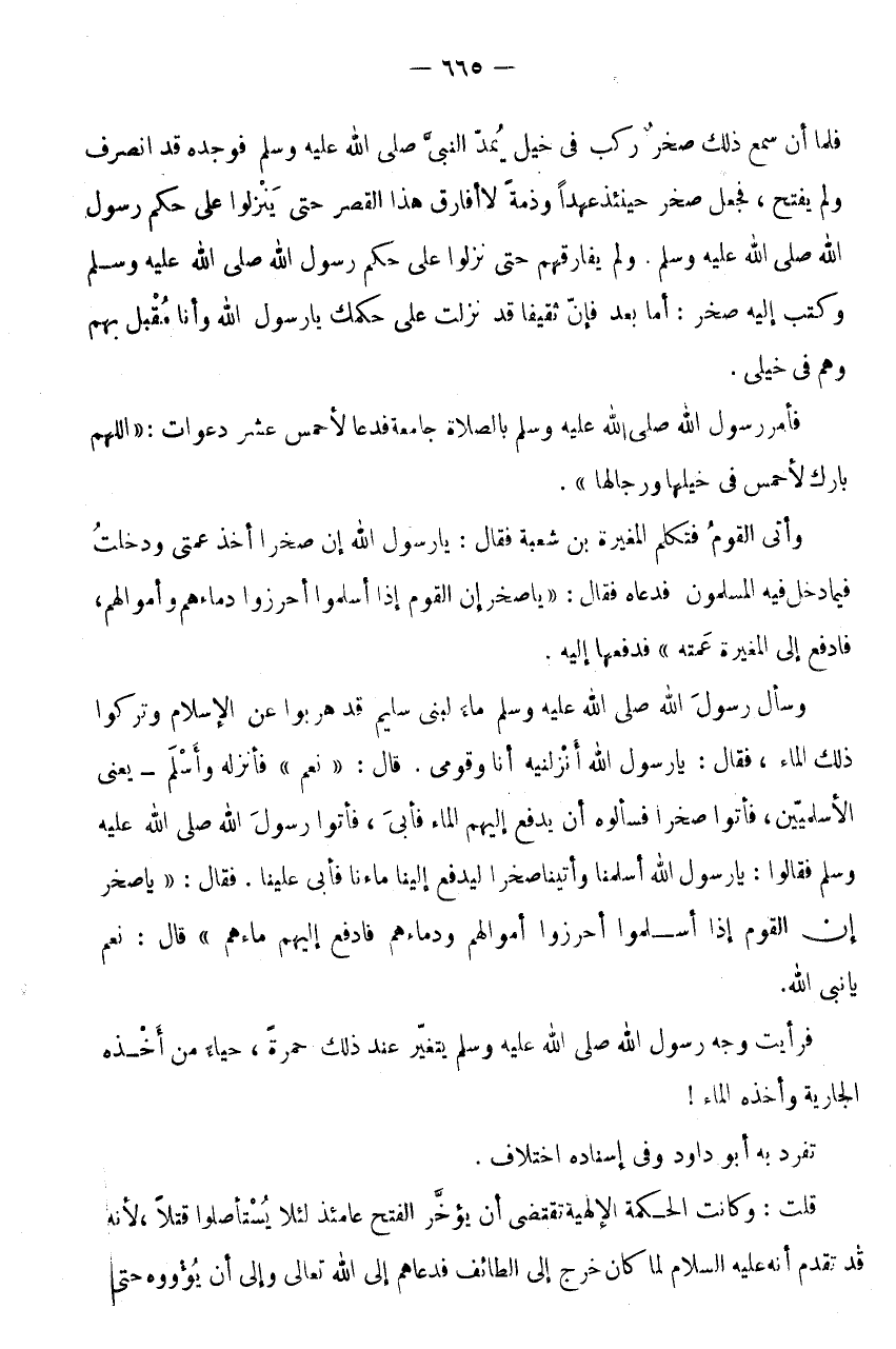 فَقَالَ: " يَا صَخْرُ إِنَّ الْقَوْمَ إِذَا أَسْلَمُوا أَحْرَزُوا أَمْوَالَهُمْ وَدِمَاءَهُمْ فَادْفَعْ إِلَيْهِمْ مَاءَهُمْ " قَالَ: نَعَمْ يَا نَبِيَّ اللَّهِ.
