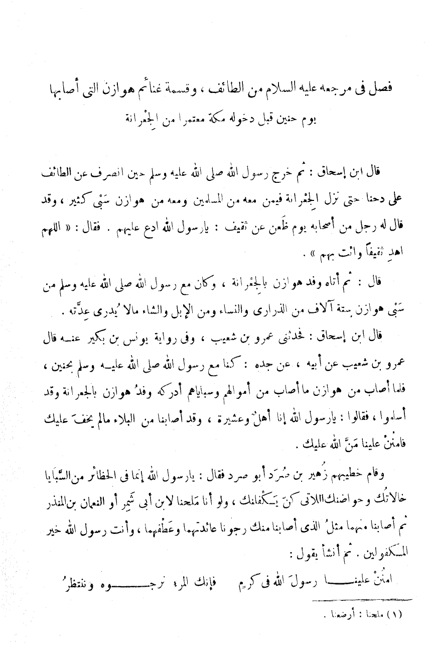 قَالَ ابْنُ إِسْحَاقَ: فَحَدَّثَنِي عَمْرُو بْنُ شُعَيْبٍ، وَفِي رِوَايَةِ يُونُسَ بْنِ بُكَيْرٍ عَنهُ قَالَ عَمْرِو بْنِ شُعَيْبٍ عَنْ أَبِيهِ، عَنْ جَدِّهِ: كُنَّا مَعَ رَسُولِ اللَّهِ صَلَّى اللَّهُ عَلَيْهِ وَسَلَّمَ بِحُنَيْنٍ، فَلَمَّا أَصَابَ مِنْ هَوَازِنَ مَا أَصَابَ مِنْ أَمْوَالِهِمْ وَسَبَايَاهُمْ أَدْرَكَهُ وَفْدُ هَوَازِنَ بِالْجِعْرَانَةِ وَقَدْ أَسْلَمُوا، فَقَالُوا: يَا رَسُولَ اللَّهِ إِنَّا أهل وَعَشِيرَةٌ، وَقَدْ أَصَابَنَا مِنَ الْبَلَاءِ مَا لَمْ يَخْفَ عَلَيْكَ فَامْنُنْ عَلَيْنَا مَنَّ اللَّهُ عَلَيْكَ.