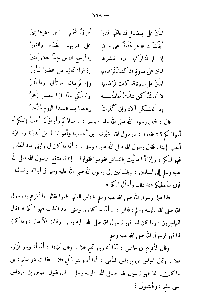 امْنُنْ عَلَى بَيْضَةٍ قَدْ عَاقَهَا قَدَرٌ * مُمَزَّقٍ شَمْلُهَا فِي دَهْرِهَا غِيَرُ أَبْقَتْ لَنَا الدَّهْرَ هُتَّافًا عَلَى حَزَنٍ * عَلَى قُلُوبِهُمُ الْغَمَّاءُ وَالْغُمَرُ إِنْ لَمْ تَدَارَكْهَا نَعْمَاءُ تَنْشُرُهَا * يَا أَرْجَحَ النَّاسِ حِلْمًا حِينَ يُخْتَبَرُ امْنُنْ عَلَى نِسْوَةٍ قَدْ كُنْتَ تَرْضَعُهَا * إِذْ فُوكَ تَمْلَؤُهُ مِنْ مَحْضِهَا الدِّرَرُ امْنُنْ عَلَى نِسْوةٍ قَدْ كُنْتَ تَرْضَعُهَا * وَإِذْ يَزِينُكَ مَا تَأْتِي وَمَا تَذَرُ لَا تَجْعَلَنَّا كَمَنْ شَالَتْ نَعَامَتُهُ * وَاسْتَبْقِ مِنَّا فَإِنَّا مَعْشَرٌ زُهُرُ إِنَّا لَنَشْكُرُ آلَاءً وَإِنْ كُفِرَتْ * وَعِنْدَنَا بَعْدَ هَذَا الْيَوْمِ مُدَّخَرُ قَالَ: فَقَالَ رَسُولُ اللَّهِ صَلَّى اللَّهُ عَلَيْهِ وَسَلَّمَ: " نِسَاؤُكُمْ وَأَبْنَاؤُكُمْ أَحَبُّ إِلَيْكُمْ أَمْ أَمْوَالُكُمْ؟ " فَقَالُوا: يَا رَسُولَ اللَّهِ خَيَّرْتَنَا بَيْنَ أَحِسَابِنَا وَأَمْوَالِنَا؟ بَلْ أَبْنَاؤُنَا وَنِسَاؤُنَا
