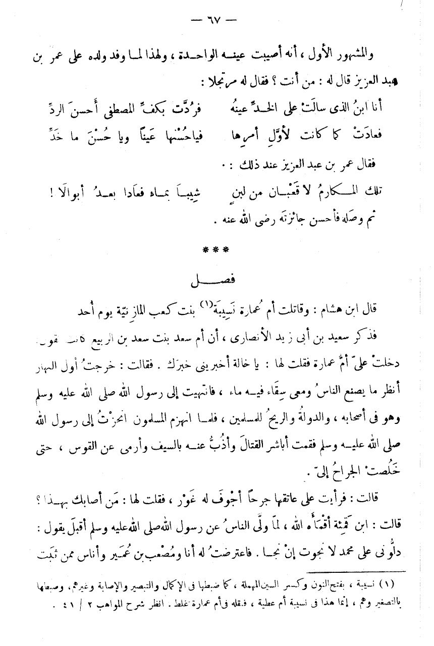 * * * فَصْلٌ قَالَ ابْنُ هِشَامٍ: وَقَاتَلَتْ أُمُّ عُمَارَةَ نَسِيبَةُ (1) بِنْتُ كَعْبٍ الْمَازِنِيَّةُ يَوْمَ أُحُدٍ.