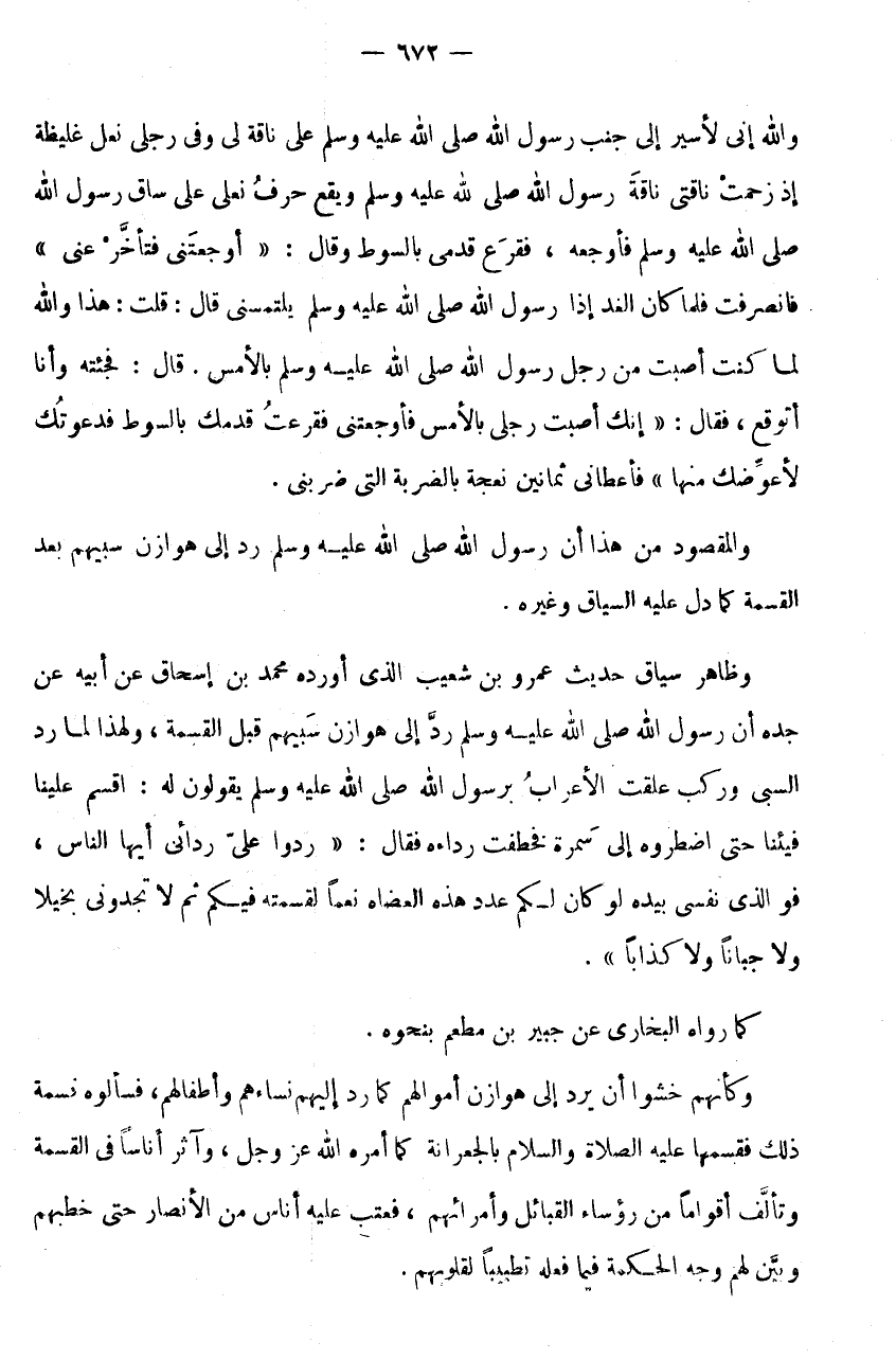 وَظَاهِرُ سِيَاقِ حَدِيثِ عَمْرِو بْنِ شُعَيْب الذى أوردهُ مُحَمَّد بن إِسْحَاق عَنْ أَبِيهِ عَنْ جَدِّهِ أَنَّ رَسُولَ اللَّهِ صَلَّى اللَّهُ عَلَيْهِ وَسَلَّمَ رَدَّ إِلَى هَوَازِنَ سَبْيَهُمْ قَبْلَ الْقِسْمَةِ، وَلِهَذَا لَمَّا رَدَّ