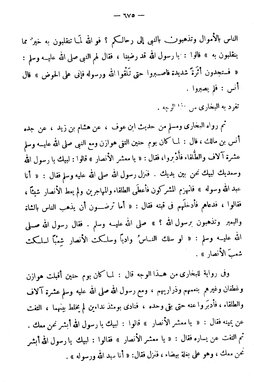 ثُمَّ رَوَاهُ البُخَارِيّ وَمُسلم من حَدِيث ابْن عَوْف، عَنْ هِشَامِ بْنِ زَيْدٍ، عَنْ جَدِّهِ أَنَسِ بْنِ مَالِكٍ، قَالَ: لَمَّا كَانَ يَوْمُ حُنَيْنٍ الْتَقَى هَوَازِنُ وَمَعَ النَّبِيِّ صَلَّى اللَّهُ عَلَيْهِ وَسَلَّمَ عَشَرَةُ آلَافٍ وَالطُّلَقَاءُ فَأَدْبَرُوا، فَقَالَ: " يَا مَعْشَرَ الْأَنْصَارِ " قَالُوا: لَبَّيْكَ يَا رَسُولَ اللَّهِ وَسَعْدَيْكَ لَبَّيْكَ نَحْنُ بَيْنَ يَدَيْكَ.