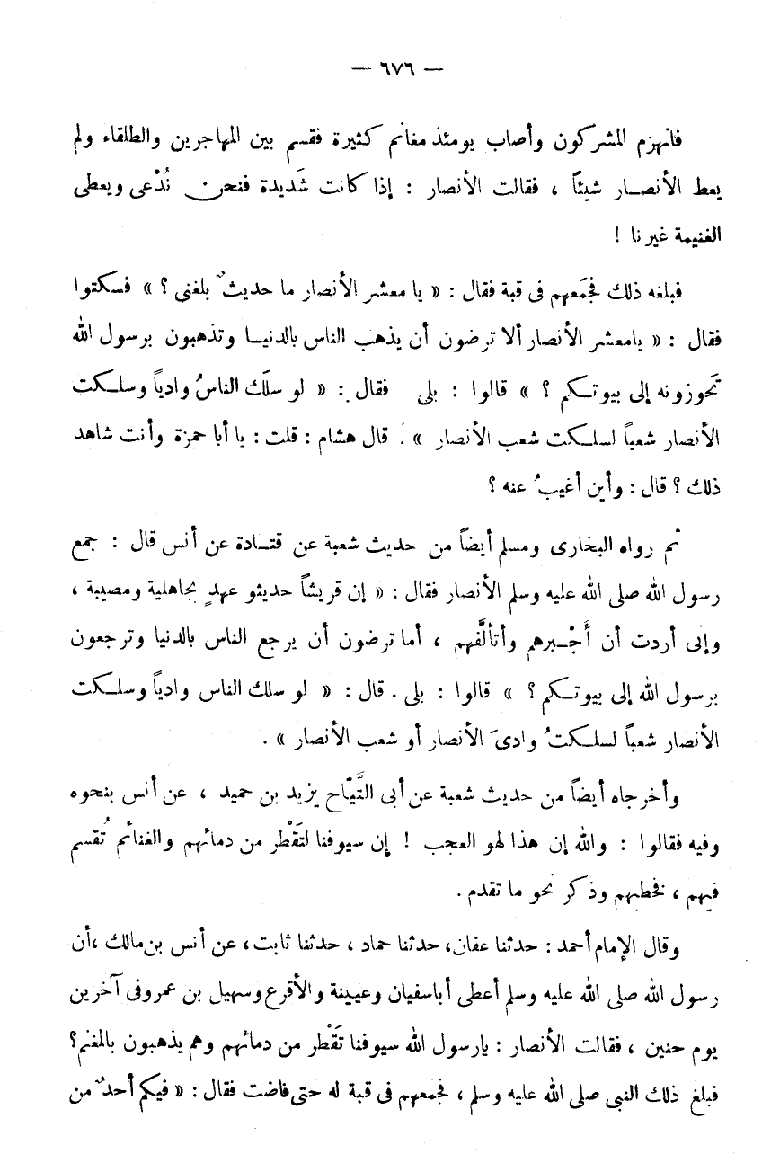 قَالَ هِشَامٌ: قُلْتُ: يَا أَبَا حَمْزَةَ وَأَنْتَ شَاهِدٌ ذَلِكَ؟ قَالَ: وَأَيْنَ أَغِيبُ عَنْهُ؟ ثُمَّ رَوَاهُ الْبُخَارِيُّ وَمُسْلِمٌ أَيْضًا مِنْ حَدِيثِ شُعْبَةَ عَنْ قَتَادَةَ عَنْ أَنَسٍ قَالَ: جَمَعَ رَسُولُ اللَّهِ صَلَّى اللَّهُ عَلَيْهِ وَسَلَّمَ الْأَنْصَارُ فَقَالَ: " إِنَّ قُرَيْشًا حَدِيثُو عَهْدٍ بِجَاهِلِيَّةٍ وَمُصِيبَةٍ، وَإِنِّي أَرَدْتُ أَنْ أُجْبِرَهُمْ وَأَتَأَلَّفَهُمْ، أَمَا تَرْضَوْنَ أَنْ يَرْجِعَ النَّاسُ بِالدُّنْيَا وَتَرْجِعُونَ بِرَسُولِ اللَّهِ إِلَى بُيُوتِكُمْ؟ " قَالُوا: بَلَى.