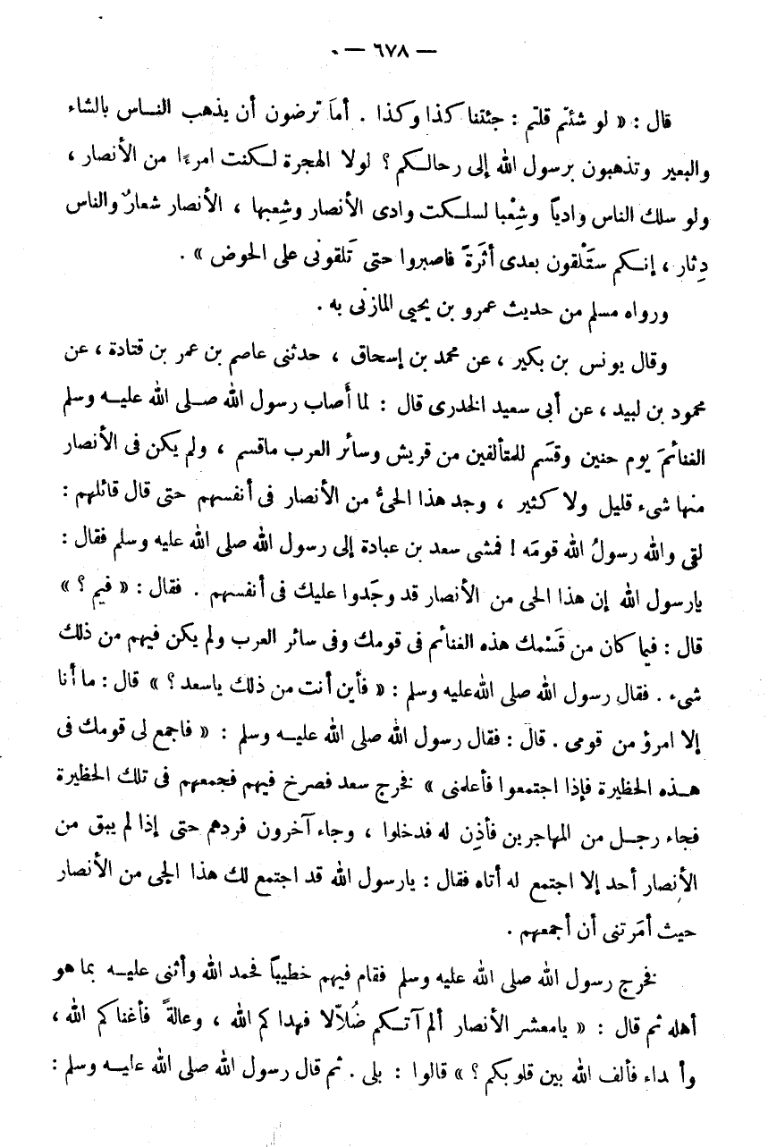 أَمَا تَرْضَوْنَ أَنْ يَذْهَبَ النَّاسُ بِالشَّاءِ وَالْبَعِيرِ وَتَذْهَبُونَ بِرَسُولِ اللَّهِ إِلَى رِحَالِكُمْ؟ لَوْلَا الْهِجْرَةُ لَكُنْت إمرءا مِنَ الْأَنْصَارِ، وَلَوْ سَلَكَ النَّاسُ وَادِيًا وَشِعْبًا لَسَلَكْتُ وَادِيَ الْأَنْصَارِ وَشِعْبَهَا، الْأَنْصَارُ شِعَارٌ وَالنَّاسُ دِثَارٌ، إِنَّكُمْ سَتَلْقَوْنَ بَعْدِي أَثَرَةً فَاصْبِرُوا حَتَّى تَلْقَوْنِي عَلَى الْحَوْضِ ".