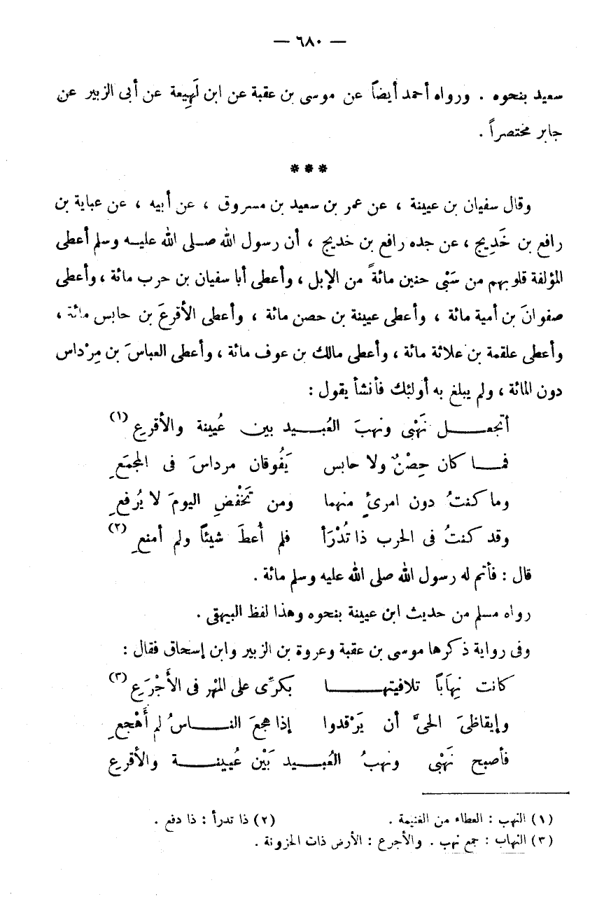 * * * وَقَالَ سُفْيَانُ بْنُ عُيَيْنَةَ، عَنْ عُمَرَ بْنِ سَعِيدِ بْنِ مَسْرُوقٍ، عَنْ أَبِيهِ، عَن عَبَايَة بْنِ رَافِعِ بْنِ خَدِيجٍ، عَنْ جَدِّهِ رَافِعِ بْنِ خَدِيجٍ، أَنَّ رَسُولَ اللَّهِ صَلَّى اللَّهُ عَلَيْهِ وَسَلَّمَ أَعْطَى الْمُؤَلَّفَةَ قُلُوبُهُمْ مِنْ سَبْيِ حنين مائَة من الابل، وَأعْطى أَبَا سُفْيَانَ بْنَ حَرْبٍ مِائَةً، وَأَعْطَى صَفْوَانَ بْنَ أُمَيَّةَ مِائَةً، وَأَعْطَى عُيَيْنَةَ بْنَ حِصْنٍ مِائَةً، وَأَعْطَى الْأَقْرَعَ بْنَ حَابِسٍ مِائَةً، وَأَعْطَى عَلْقَمَةَ بْنَ عُلَاثَةَ مِائَةً، وَأَعْطَى مَالِكَ بْنَ عَوْفٍ مِائَةً، وَأَعْطَى الْعَبَّاسَ بْنَ مِرْدَاسٍ دُونَ الْمِائَةِ، وَلَمْ يُبَلِّغْ بِهِ أُولَئِكَ فَأَنْشَأَ يَقُولُ: أَتَجْعَلُ نَهْبِي وَنَهْبَ الْعُبَيْدِ بَيْنَ عُيَيْنَةَ وَالْأَقْرَعِ (1) فَمَا كَانَ حِصْنٌ وَلَا حَابِسٌ * يَفُوقَانِ مِرْدَاسَ فِي الْمجمع وَمَا كُنْتُ دُونَ امْرِئٍ مِنْهُمَا * وَمَنْ تَخْفِضُ الْيَوْمَ لَا يُرْفَعُ وَقَدْ كُنْتُ فِي الْحَرْبِ ذَا تُدْرَأٍ * فَلَمْ أُعْطَ شَيْئًا وَلَمْ أُمْنَعِ (2) قَالَ: فَأَتَمَّ لَهُ رَسُولُ اللَّهِ صَلَّى اللَّهُ عَلَيْهِ وَسَلَّمَ مِائَةً.